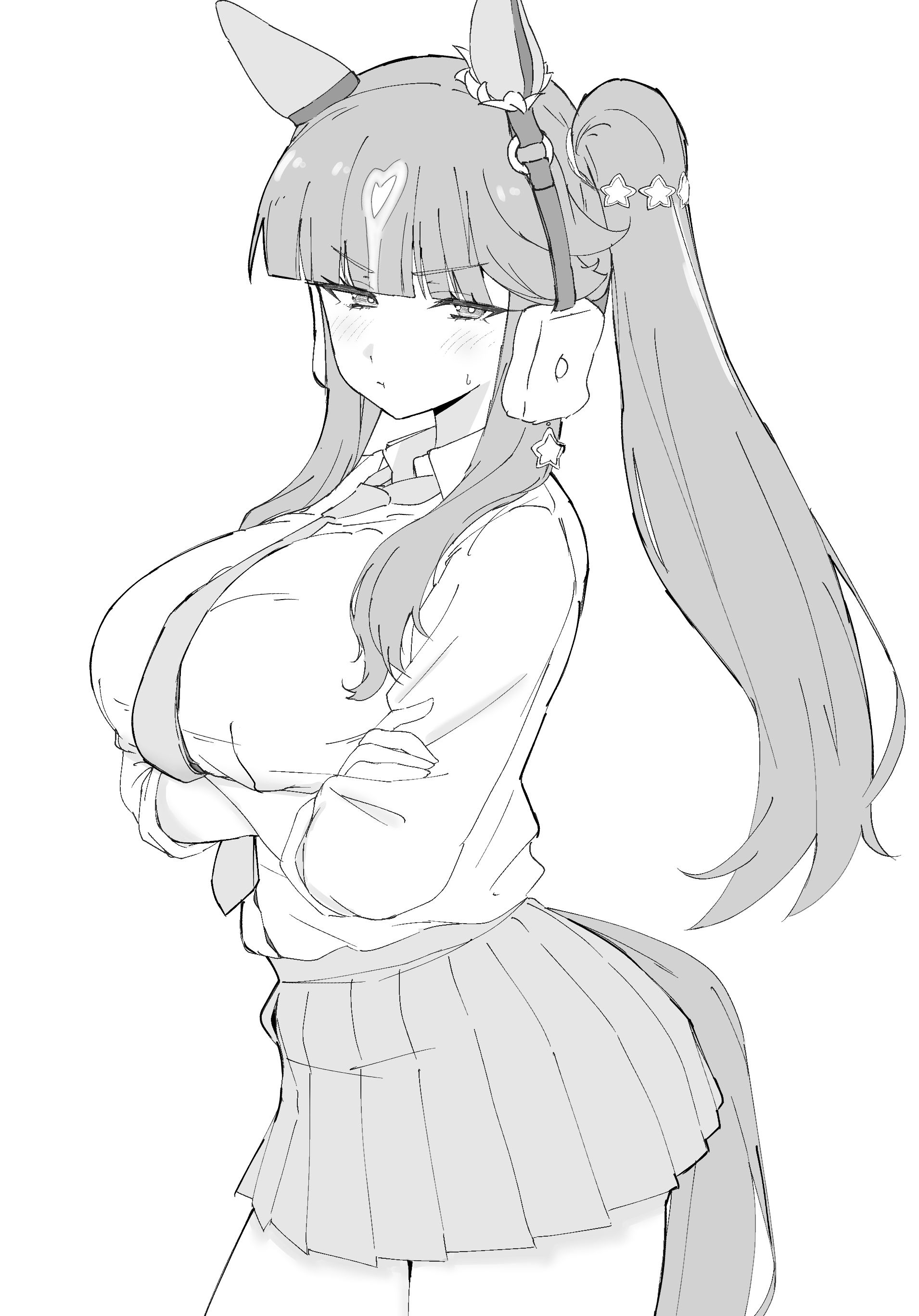 1girl absurdres alternate_costume animal_ears blunt_bangs blush breasts closed_mouth commentary_request crossed_arms greyscale hair_between_eyes hair_ornament highres horse_ears horse_tail large_breasts looking_at_viewer lucky_lilac_(umamusume) monochrome side_ponytail solo sweatdrop tail takapachi.jp thighs umamusume white_background