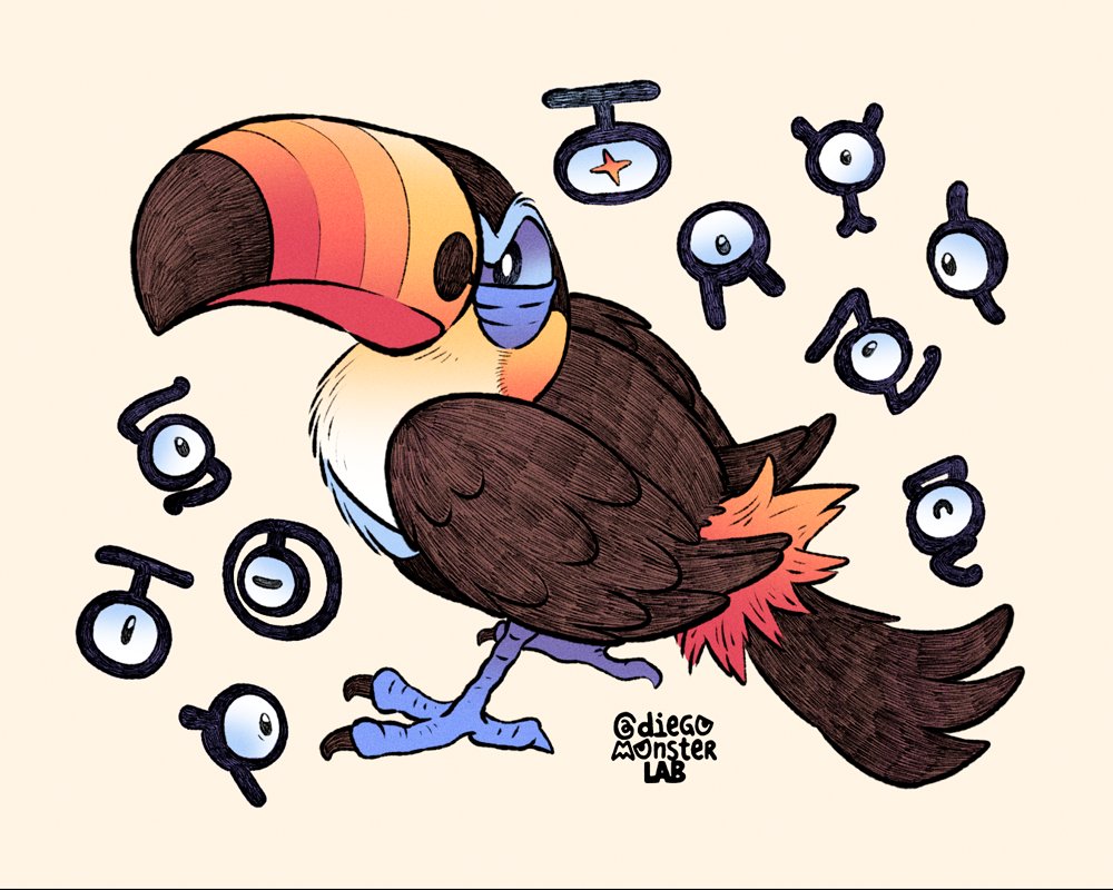 artist_name bird commentary diegomonsterlab english_commentary gen_2_pokemon gen_7_pokemon looking_at_viewer nintendo no_humans parrot pokemon pokemon_(creature) simple_background toucannon unown unown_g unown_i unown_n unown_o unown_p unown_r unown_s unown_t unown_y white_background