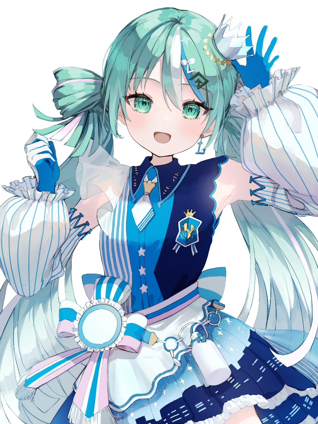 1girl arm_up armpits blue_shirt blush breasts collared_shirt commentary_request crown detached_sleeves frilled_shirt frills gloves green_eyes green_hair hair_between_eyes hair_ornament hand_up hatsune_miku highres lawson long_hair long_sleeves looking_at_viewer medium_breasts mini_crown n_karakure open_mouth shirt simple_background sleeveless sleeveless_shirt solo star_(symbol) star_hair_ornament tilted_headwear twintails very_long_hair vocaloid white_background white_gloves
