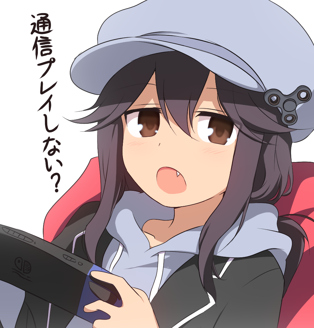 1girl :o black_hair black_jacket blazer brown_eyes commentary curakuru curakuru_(character) double-parted_bangs fang fidget_spinner grey_hat grey_hoodie hair_between_eyes handheld_game_console hat hat_ornament holding holding_handheld_game_console hood hoodie jacket long_hair long_sidelocks looking_at_viewer newsboy_cap nintendo_switch open_clothes open_jacket open_mouth original sidelocks solo translation_request upper_body