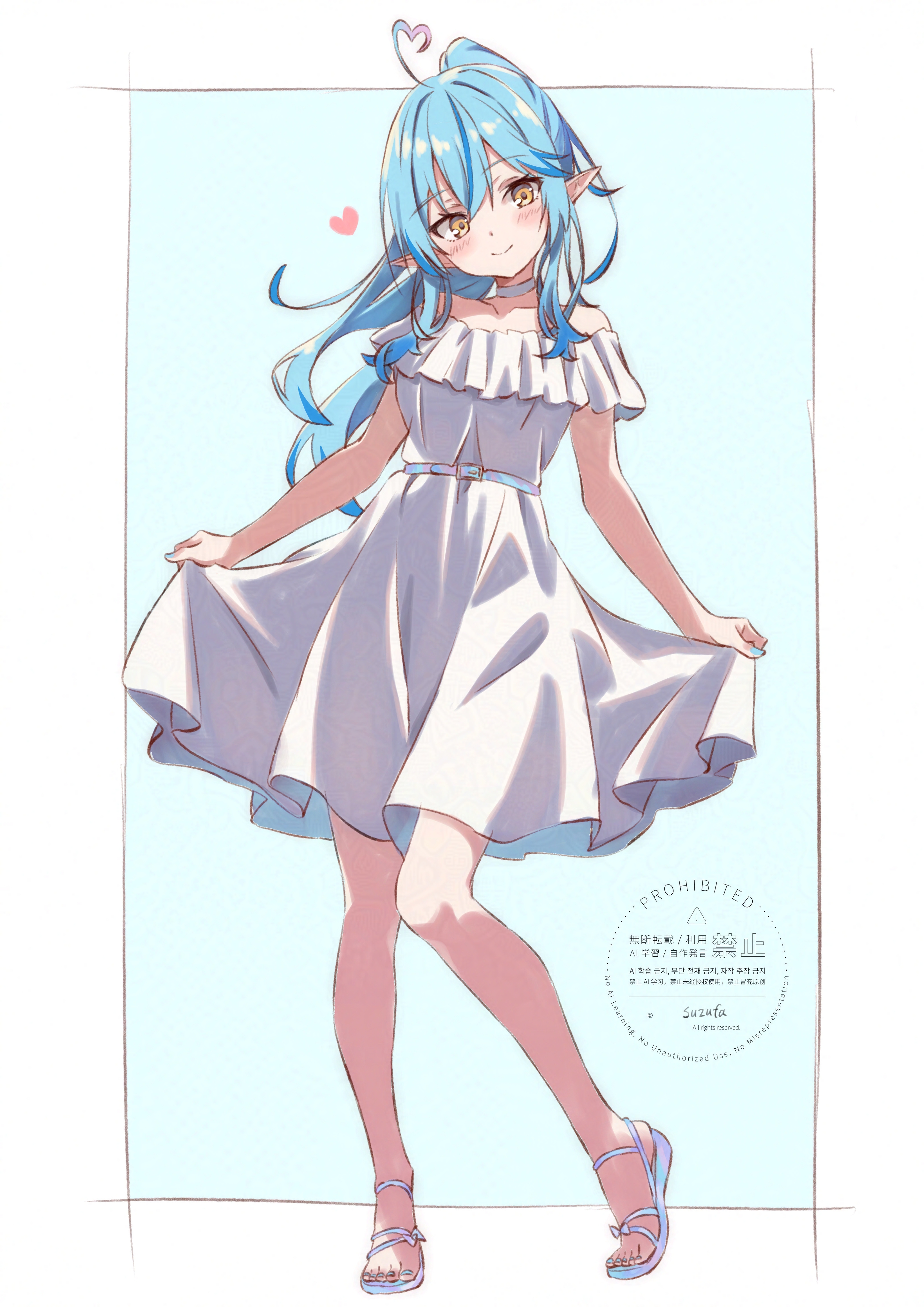 1girl absurdres ahoge bare_shoulders blue_hair blush breasts commentary_request dress elf feet full_body heart heart_ahoge highres hololive large_breasts pointy_ears simple_background solo suzufa toes virtual_youtuber white_background white_dress yellow_eyes yukihana_lamy yukihana_lamy_(holonatsu_paradise)