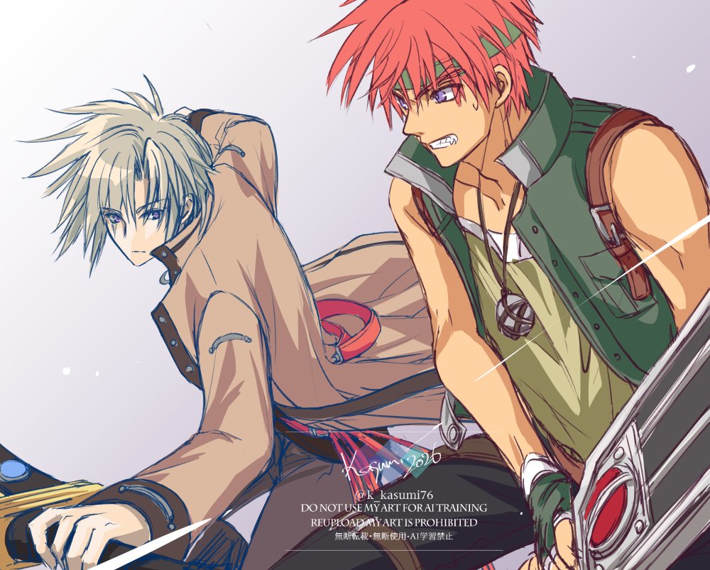 2boys agate_crosner artist_logo brown_coat clenched_teeth closed_mouth coat commentary_request curtained_hair eiyuu_densetsu floating_clothes gradient_background green_headband green_jacket grey_background grey_hair hair_between_eyes headband holding holding_sword holding_weapon huge_weapon jacket jewelry leonhardt_(eiyuu_densetsu) logo male_focus multiple_boys necklace parted_bangs parted_lips pendant popped_collar purple_eyes red_hair saya001 signature sleeveless sleeveless_jacket sora_no_kiseki sweatdrop sword teeth twitter_username upper_body watermark weapon
