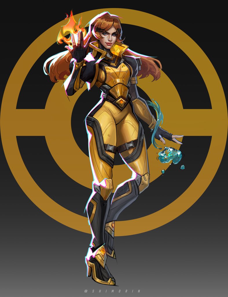 1girl adapted_costume aqua_eyes armor black_gloves black_jacket black_trim bodysuit boots breastplate commentary crystal_(marvel) english_commentary fire full_body gloves gradient_background grey_background high_heel_boots high_heels hydrokinesis inhumans jacket knee_pads long_hair looking_at_viewer marvel marvel_rivals marvel_rivals_(style) orange_hair puffy_short_sleeves puffy_sleeves pyrokinesis shim0rin short_sleeves smile solo twitter_username water yellow_armor yellow_bodysuit yellow_trim
