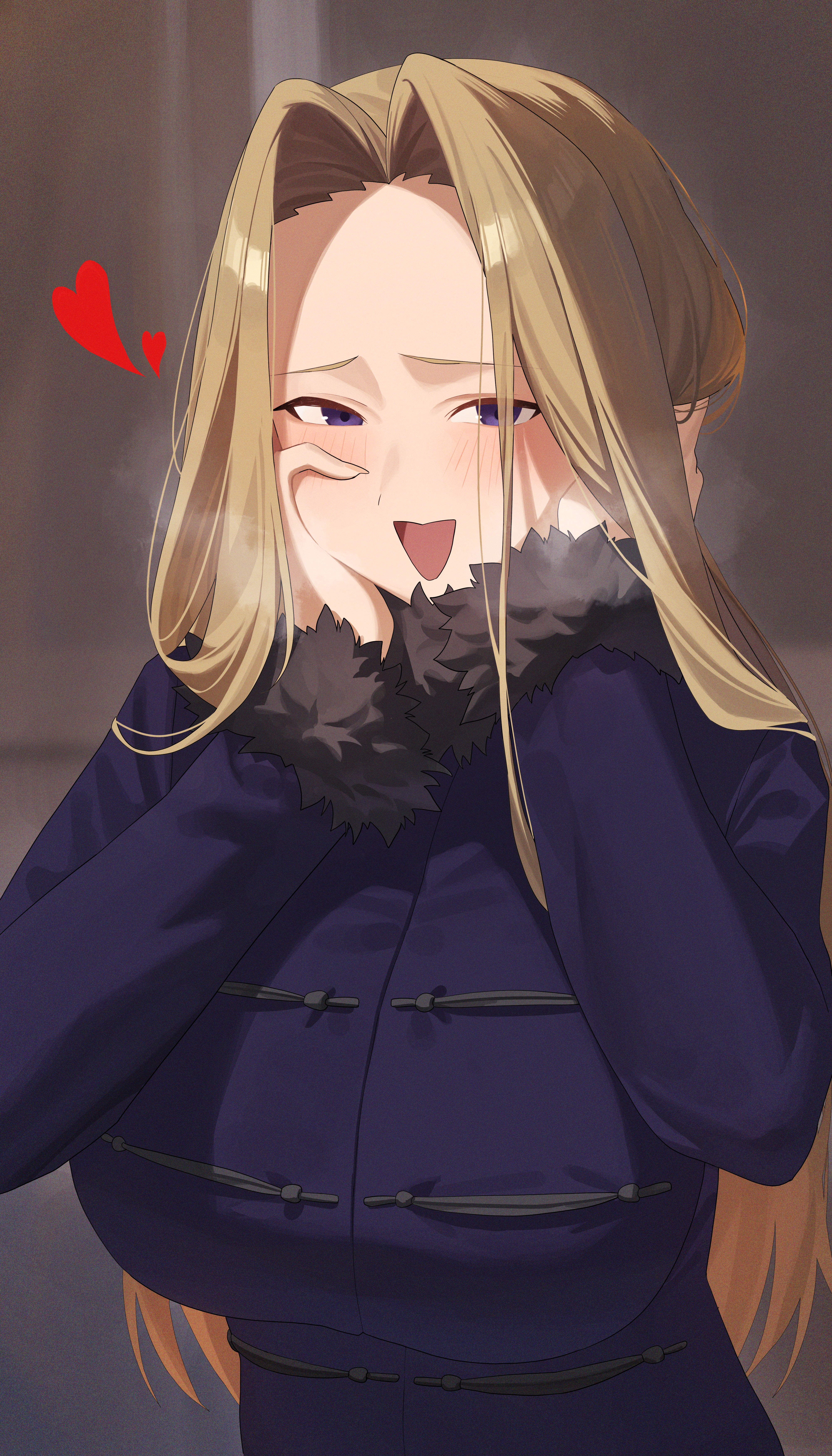 1girl absurdres blonde_hair blush coat commentary forehead fur-trimmed_coat fur_trim hair_intakes hands_on_own_face highres looking_at_viewer methode_(sousou_no_frieren) mm_(mhm2592) open_mouth purple_coat purple_eyes solo sousou_no_frieren