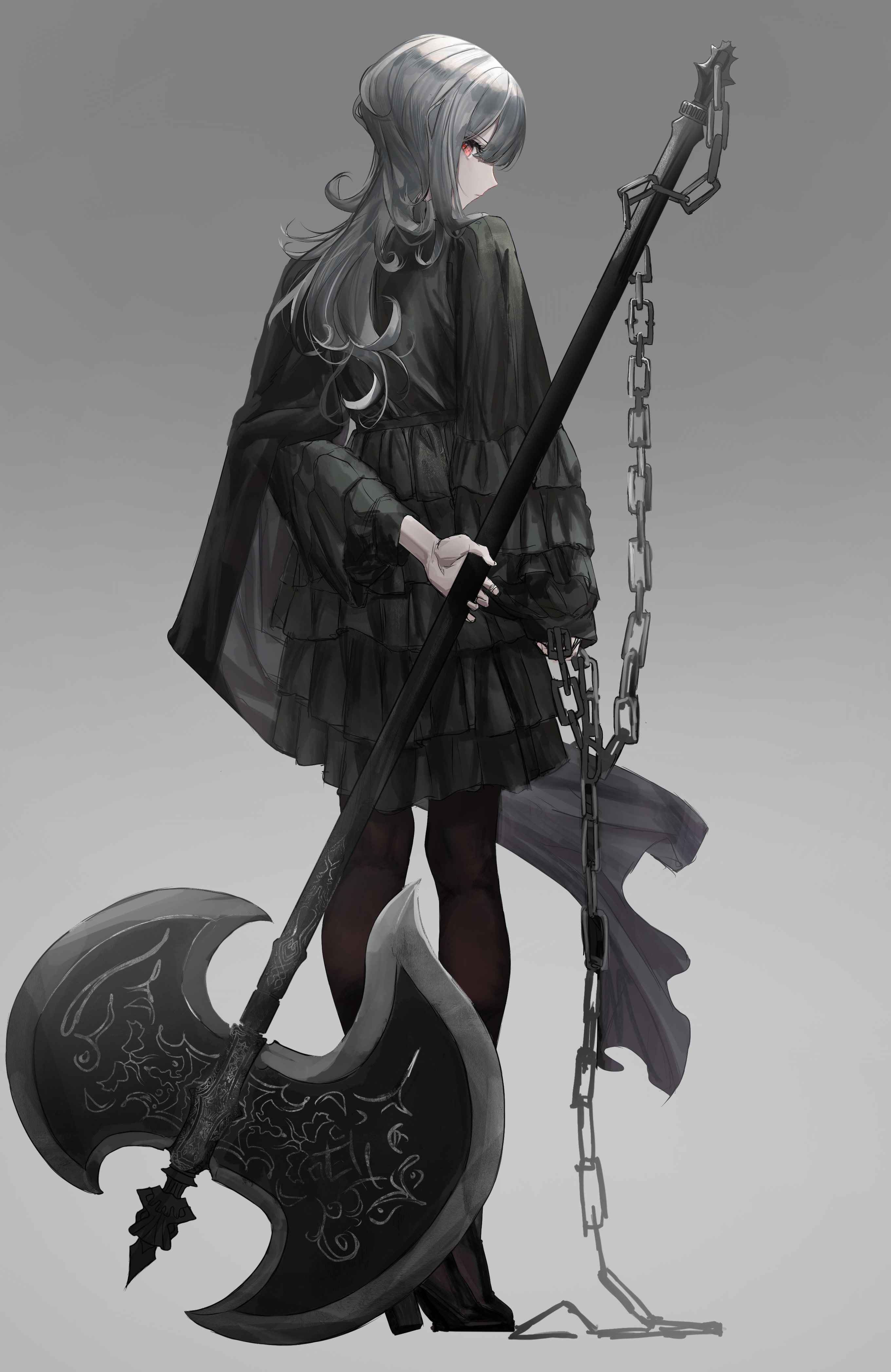 1girl absurdres axe battle_axe black_dress black_shoes chain closed_mouth commentary dress expressionless frills from_behind gradient_background grey_background grey_hair high_heels highres holding holding_weapon long_hair long_sleeves looking_at_viewer original pantyhose red_eyes sawatani_(_swt2) shoes simple_background solo standing weapon