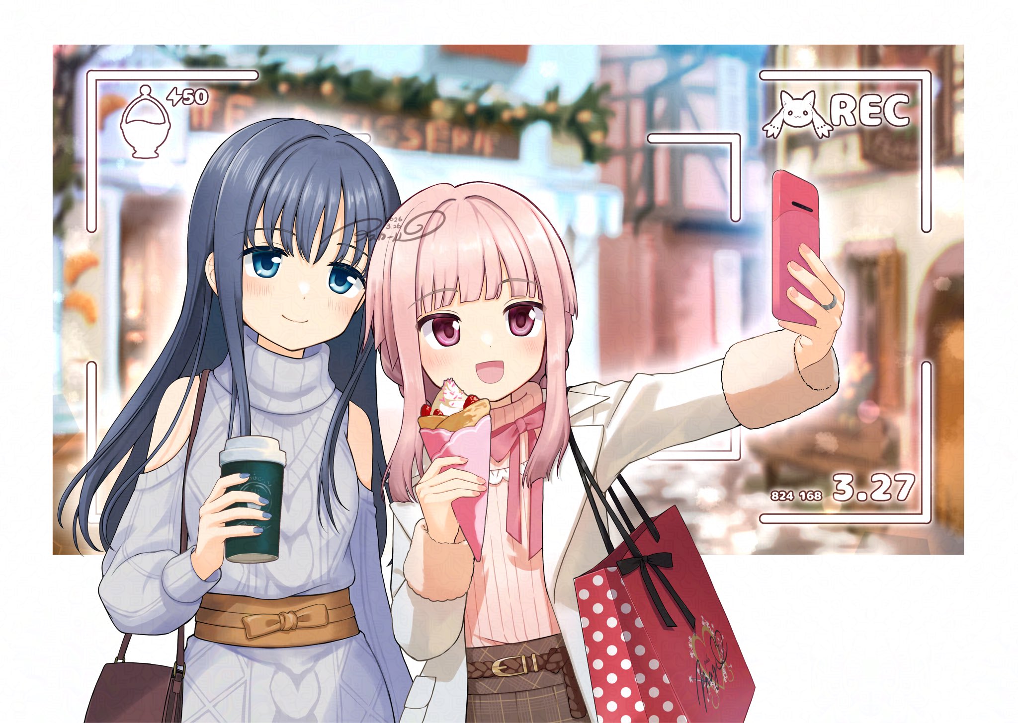 2girls :d asukaru_(magika_ru) bag bare_shoulders blue_dress blue_eyes blue_hair blunt_bangs blurry blurry_background blush border bow bowtie brown_skirt cellphone closed_mouth clothing_cutout commentary_request commission cowboy_shot crepe cup dated disposable_coffee_cup disposable_cup dot_nose dress food fur-trimmed_sleeves fur_trim hair_intakes highres holding holding_cup holding_food holding_phone jacket kyubey long_hair long_sleeves magia_record:_mahou_shoujo_madoka_magica_gaiden mahou_shoujo_madoka_magica multiple_girls nanami_yachiyo open_clothes open_jacket open_mouth outside_border phone pink_bow pink_bowtie pink_eyes pink_hair pink_sweater ribbed_sweater selfie shoulder_cutout sidelocks signature skeb_commission skirt smartphone smile soul_gem sweater sweater_dress tamaki_iroha turtleneck turtleneck_sweater viewfinder white_border white_jacket