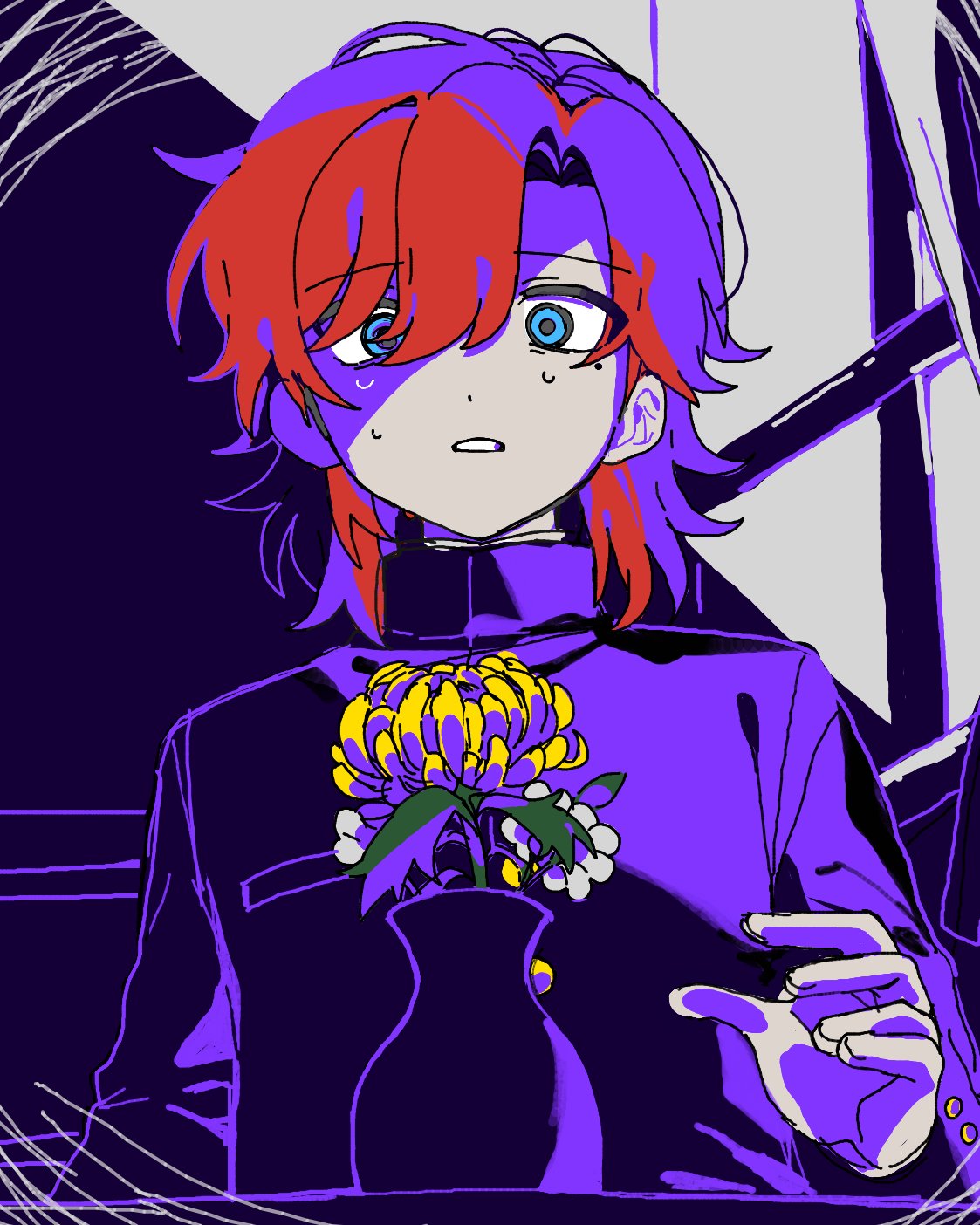 1boy blue_eyes bouquet chrysanthemum classroom clenched_teeth commentary_request flower from_below gakuran high_contrast highres hyoutenka_30-do_no_zetsubou indoors limited_palette looking_at_viewer male_focus medium_hair mole mole_under_eye ozui_(ozuizui) purple_theme red_hair sanpaku scared school_uniform solo sweat swept_bangs teeth tonimura_yui upper_body vase window