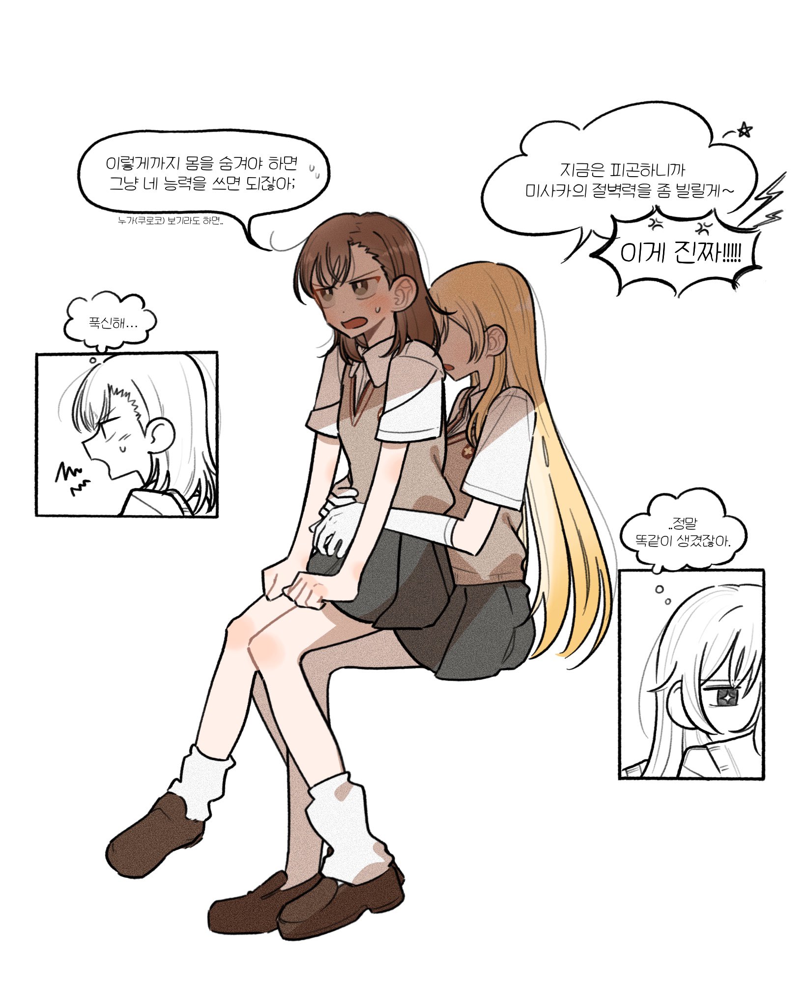 2girls blonde_hair bright_pupils brown_eyes brown_hair brown_shoes brown_sweater_vest check_commentary collared_shirt commentary_request elbow_gloves gloves grey_skirt hand_on_another's_waist highres korean_commentary korean_text loafers long_hair loose_socks medium_hair miniskirt misaka_mikoto multiple_girls otaku5252 pleated_skirt school_emblem school_uniform shirt shoes shokuhou_misaki short_sleeves sitting sitting_on_lap sitting_on_person skirt socks star-shaped_pupils star_(symbol) summer_uniform sweater_vest symbol-shaped_pupils toaru_kagaku_no_railgun toaru_majutsu_no_index tokiwadai_school_uniform translation_request v-neck white_gloves white_pupils white_shirt yuri