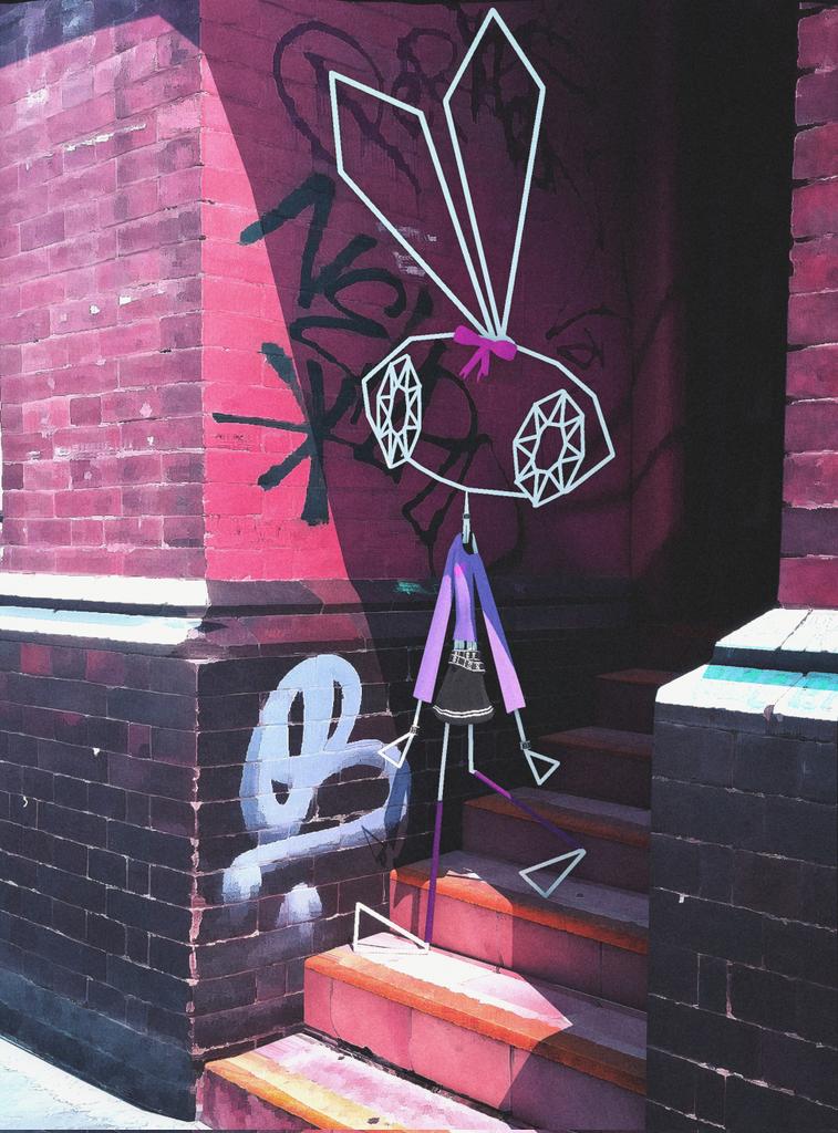 1girl alley animal_ears black_skirt bow brick_wall commentary graffiti long_sleeves outdoors p.carredo rabbit_ears skirt solo stairs stick_figure untranslatable_commentary vib-ribbon vibri_(vib-ribbon) wireframe