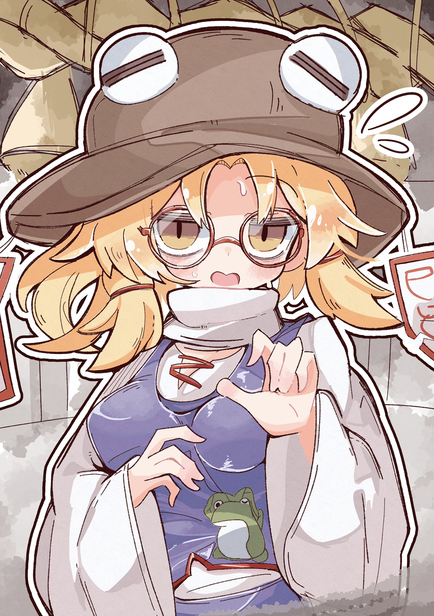 1girl animal_print blonde_hair breasts commentary_request eye_on_hat frog_print glasses highres kurakurasiteru looking_at_viewer moriya_suwako open_mouth outline purple_vest rope round_eyewear shimenawa shirt solo sweatdrop touhou vest white_outline white_shirt