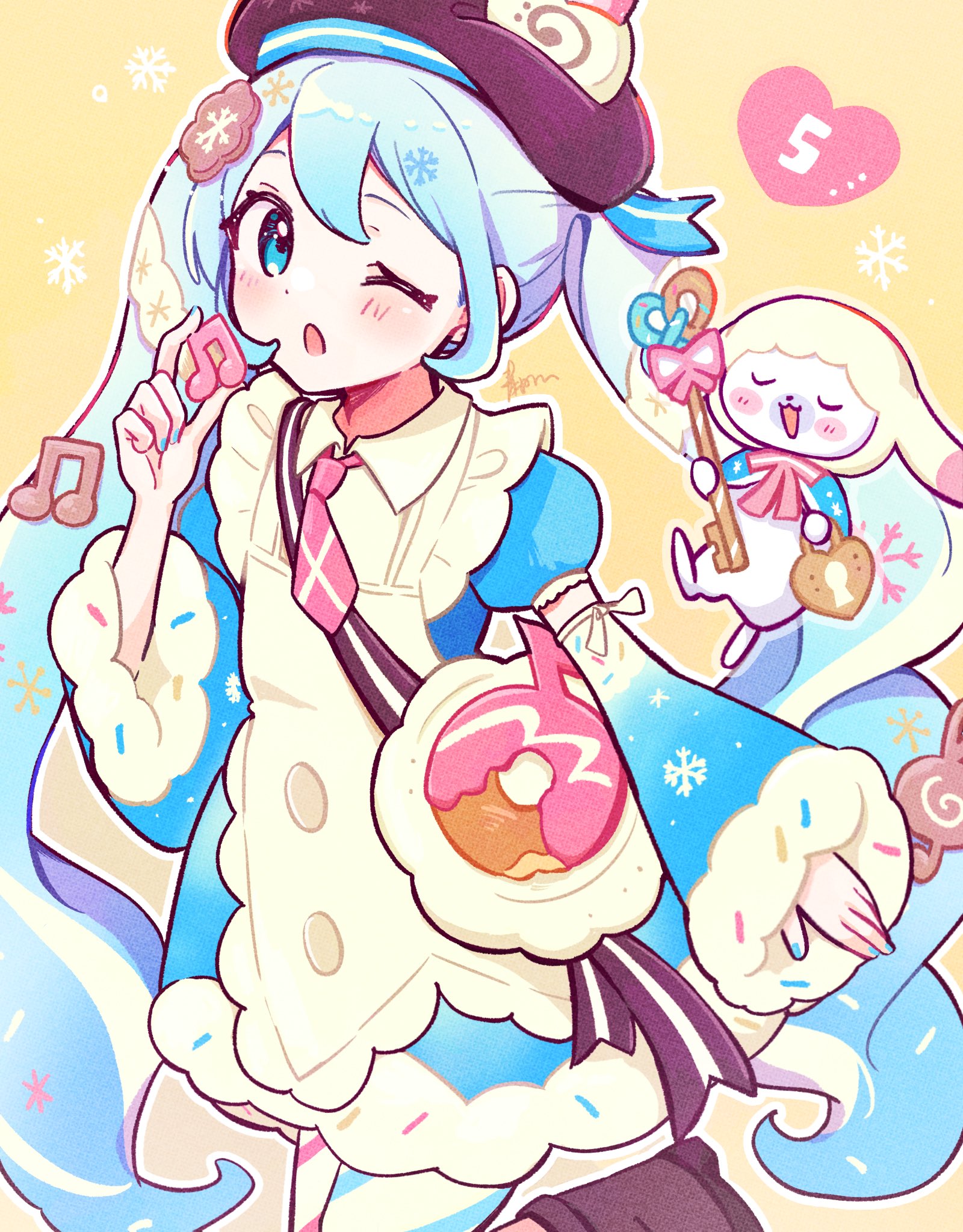 1girl aoiyui apron aqua_eyes aqua_hair beret blush brown_hat closed_eyes commentary_request cookie_hair_ornament dessert food food-themed_hair_ornament fortissimo frilled_apron frills fur-trimmed_sleeves fur_trim hair_between_eyes hair_ornament hat hatsune_miku highres key long_hair looking_at_viewer musical_note musical_note_hair_ornament necktie official_alternate_costume official_alternate_hairstyle open_mouth pink_necktie puffy_sleeves rabbit_yukine short_sleeves smile solo twintails upper_body very_long_hair vocaloid white_apron yuki_miku yuki_miku_(2026)