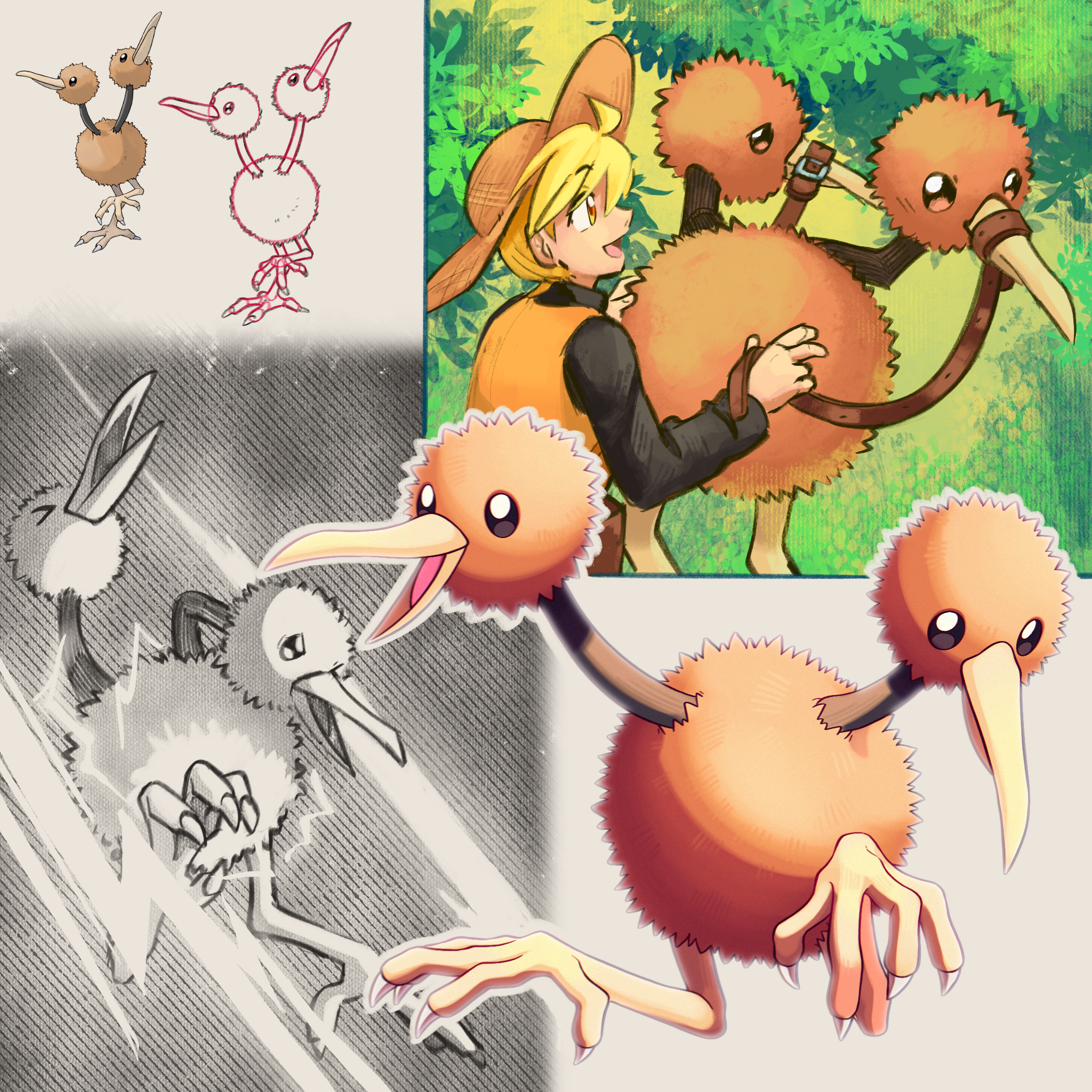 1girl bird blonde_hair commentary_request dodo_(bird) doduo gen_1_pokemon hat highres multiple_heads nintendo open_mouth orange_tunic pokemon pokemon_(creature) pokemon_adventures pokemon_firered_and_leafgreen shoupitsuki sketch straw_hat talons tunic yellow_(pokemon)