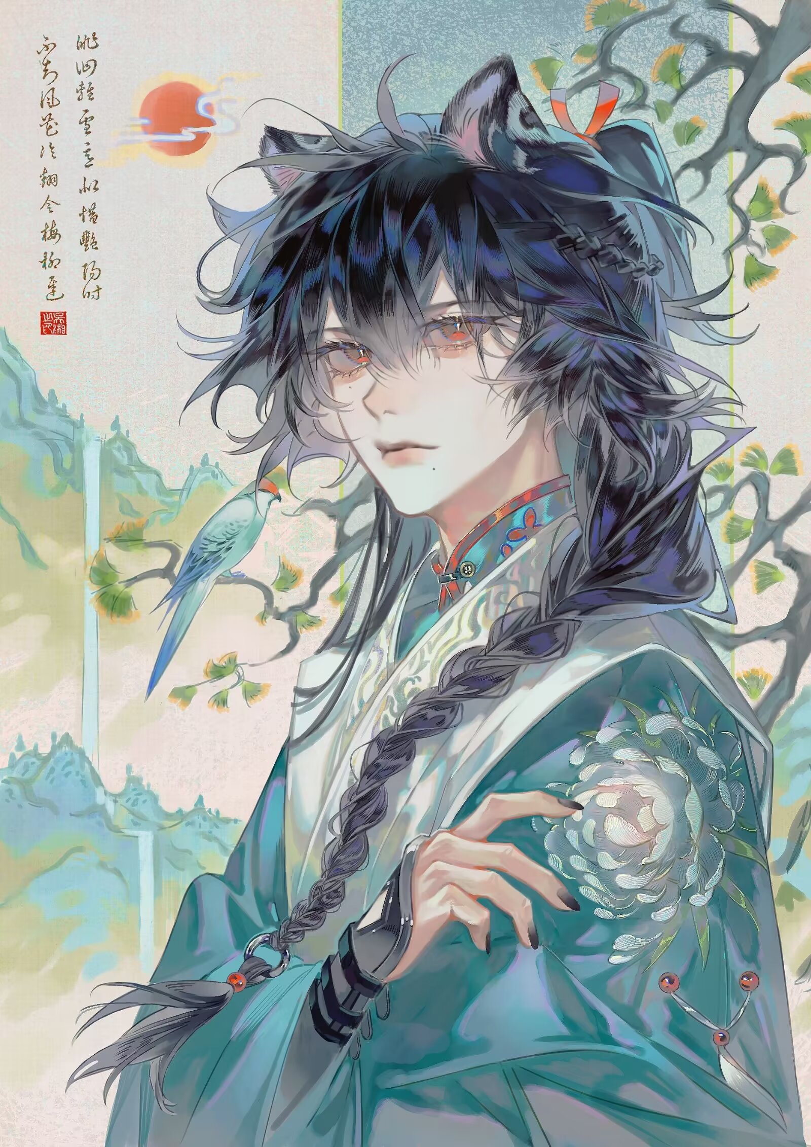 1boy aegyo_sal ahoge animal_ears aqua_robe arm_guards bijia bird bird_request black_hair black_nails braid branch bright_pupils chinese_clothes chinese_commentary chinese_text chrysanthemum_print closed_mouth commentary_request expressionless floral_print hair_between_eyes hair_extensions hair_over_shoulder hair_ribbon half_up_braid half_updo hand_on_own_arm hanfu highres jitome leopard_boy leopard_ears lips long_hair long_sleeves looking_at_viewer male_focus mole mole_under_eye mole_under_mouth mountain original pine_tree red_eyes red_ribbon ribbon ring_hair_extensions robe seal_impression single_braid slit_pupils solo sun tengyuan_bei_ze tree upper_body white_pupils wide_sleeves yellow_background