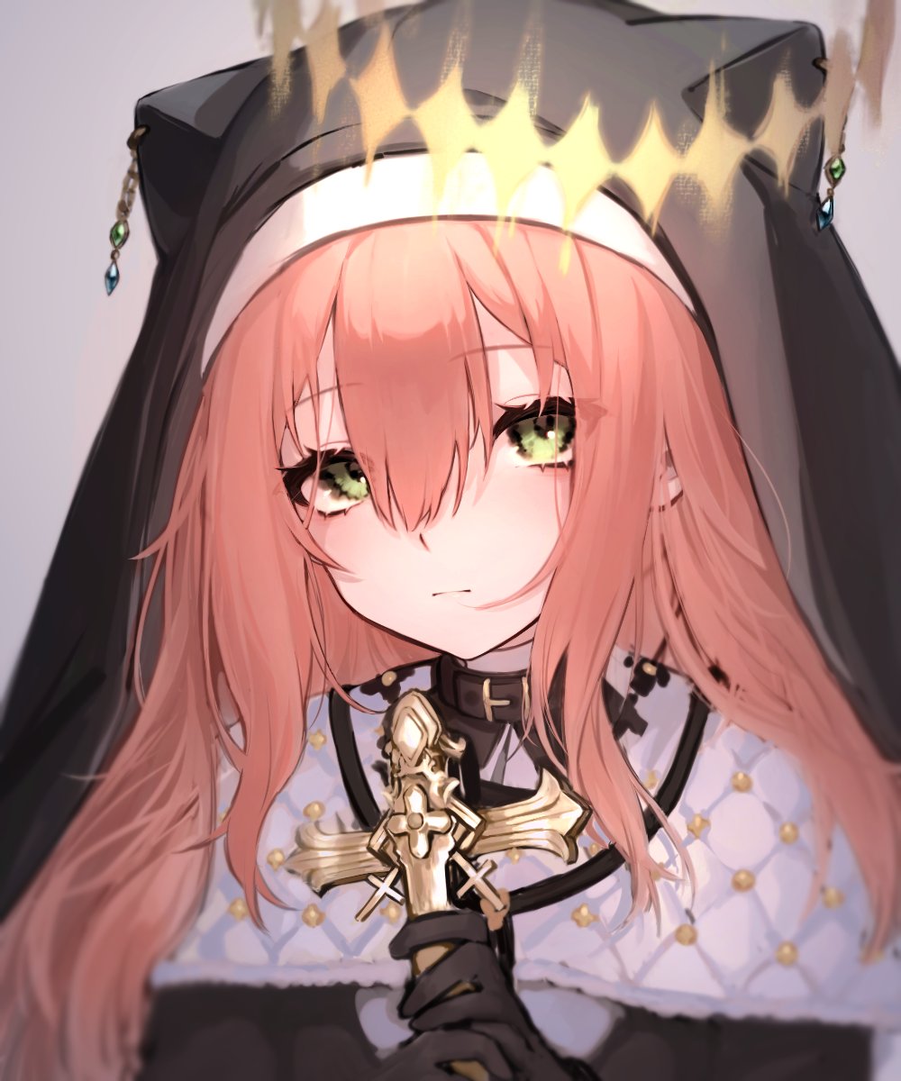 1girl black_veil blush character_request chinese_commentary closed_mouth collar commentary_request copyright_request cross gold_cross green_eyes grey_background hair_between_eyes hair_over_shoulder halo highres holding holding_cross long_hair long_sidelocks looking_at_viewer nun nun_headdress pink_hair portrait sidelocks simple_background solo star_halo tete0327 upper_body veil yellow_halo