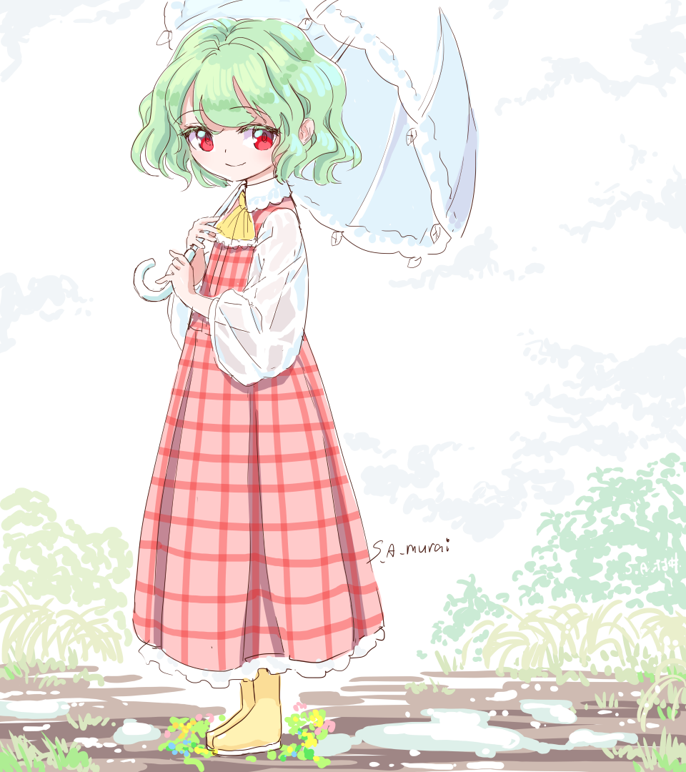 1girl artist_name ascot boots closed_mouth collared_shirt commentary_request green_hair holding holding_umbrella kazami_yuuka long_sleeves looking_at_viewer outdoors plaid_clothes plaid_skirt plaid_vest puddle red_eyes red_vest s-a-murai shirt short_hair skirt skirt_set smile solo touhou umbrella vest white_shirt yellow_ascot yellow_boots