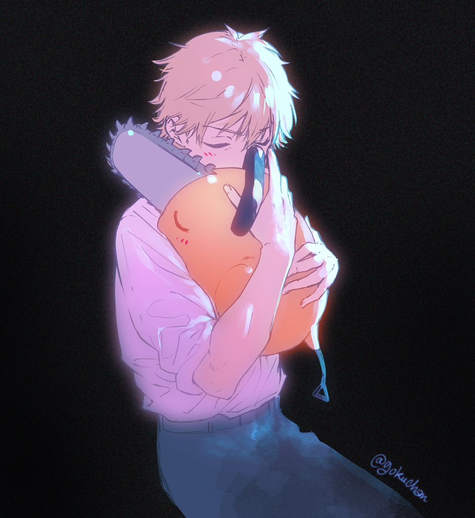 1boy belt black_background black_pants blonde_hair chainsaw chainsaw_man closed_eyes commentary_request denji_(chainsaw_man) goku-chan hug male_focus pants pochita_(chainsaw_man) shirt shirt_tucked_in short_hair simple_background twitter_username white_shirt