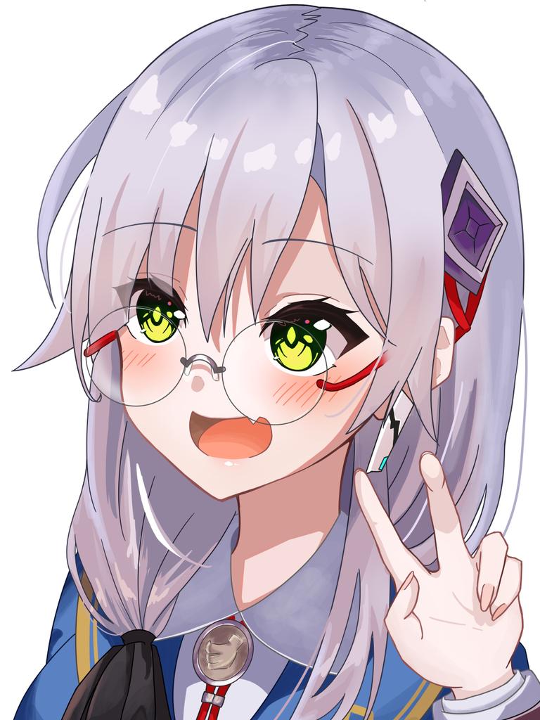 1girl :d blue_jacket blush collared_shirt commentary_request e69465 eyes_visible_through_hair fang fingernails glasses green_eyes green_pupils grey_hair hair_between_eyes hair_tie hand_up happy heaven_burns_red izumi_yuki jacket long_hair long_sleeves looking_ahead low_side_ponytail neck_ribbon open_mouth portrait red_ribbon ribbon round_eyewear shirt side_ponytail simple_background skin_fang smile solo v white_background white_shirt