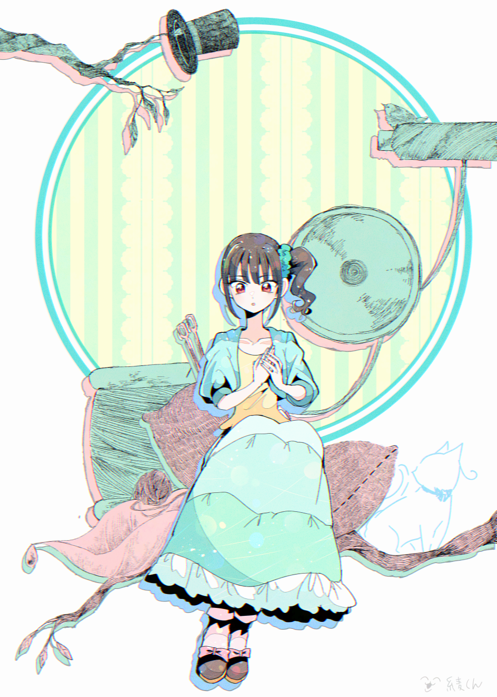 1girl :o artist_name black_hair black_hat blue_jacket bow branch brown_shoes commentary_request footwear_bow frilled_skirt frills full_body green_skirt hat highres itomugi-kun jacket long_skirt long_sleeves nekoyashiki_mayu one_side_up open_clothes open_jacket open_mouth pillow pink_bow precure shirt shoes short_hair sidelocks simple_background sitting skirt solo striped_background top_hat unworn_hat unworn_headwear vertical-striped_background white_background wonderful_precure! yarn yarn_ball yellow_shirt