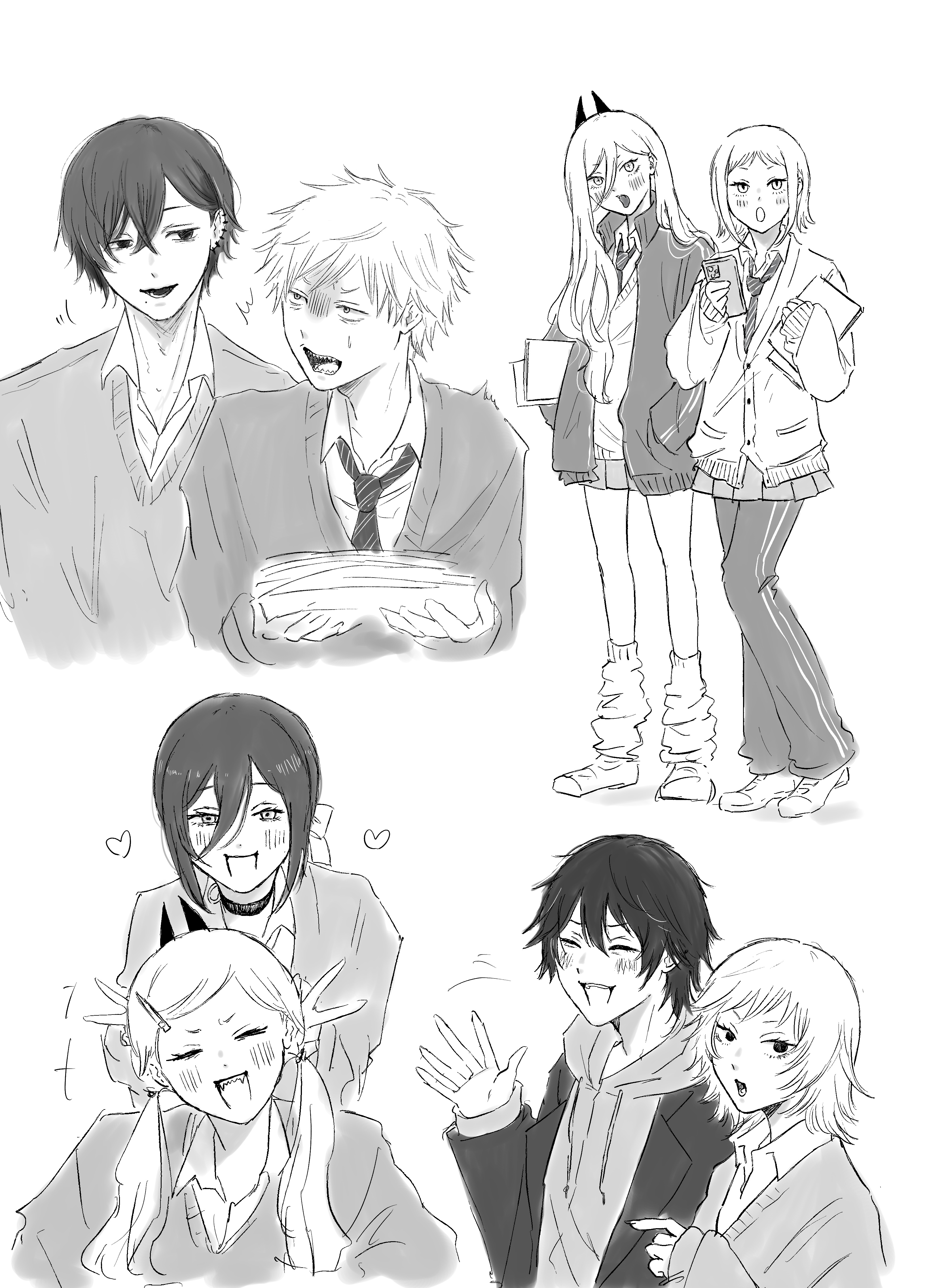 3boys 4girls absurdres chainsaw_man collared_shirt commentary_request denji_(chainsaw_man) highres iing_naoe multiple_boys multiple_girls necktie pants power_(chainsaw_man) reze_(chainsaw_man) school_uniform shirt skirt sweater