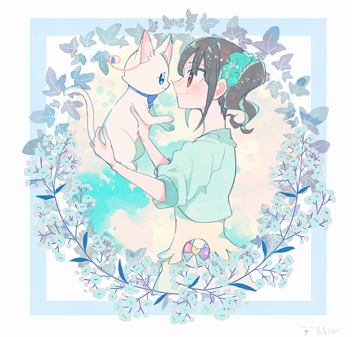 1girl animal black_hair blue_bow blue_bowtie blue_jacket bow bowtie cat closed_mouth commentary_request dress from_side green_scrunchie hair_ornament hair_scrunchie holding holding_animal itomugi-kun jacket nekoyashiki_mayu nekoyashiki_yuki nekoyashiki_yuki_(cat) one_side_up precure profile red_eyes scrunchie short-sleeved_jacket short_hair short_sleeves sidelocks smile upper_body white_dress wonderful_precure!