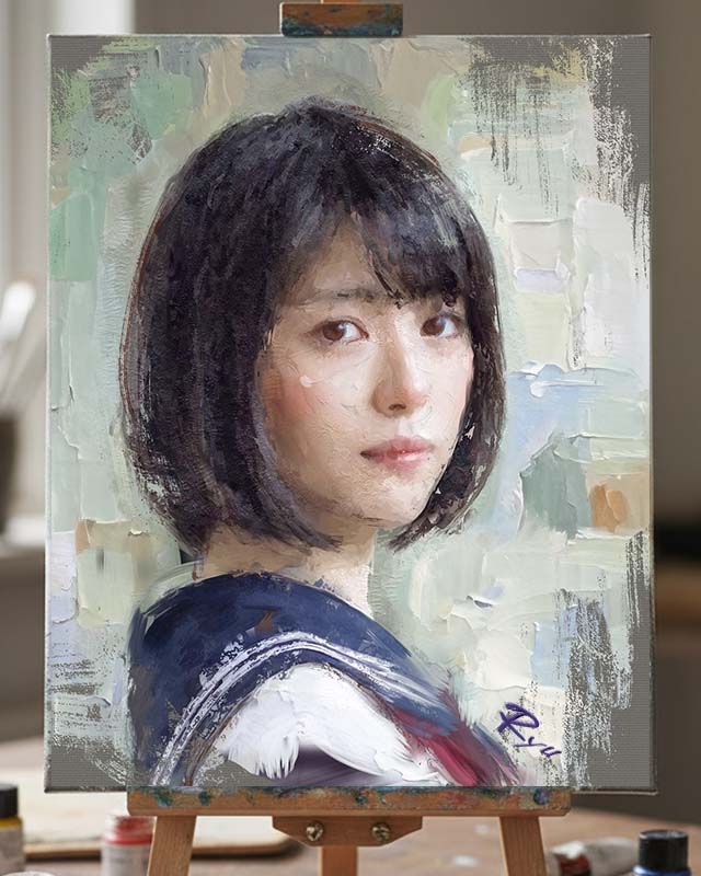 1girl artist_name black_eyes black_hair blue_sailor_collar closed_mouth commentary_request east_asian looking_at_viewer looking_to_the_side oil_painting_(medium) original painting_(medium) photo_(medium) pink_lips portrait realistic ryu_(ftyh2578) sailor_collar school_uniform short_hair solo traditional_media turning_head