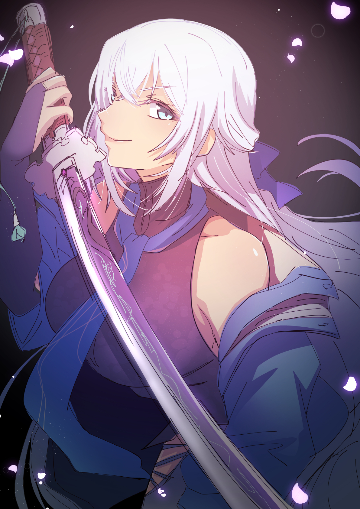 1girl bare_shoulders black_shirt blue_eyes blue_jacket blue_necktie breasts bridal_gauntlets closed_mouth commentary_request crossed_bangs double-parted_bangs eiyuu_densetsu falling_petals floating_hair hair_between_eyes half_updo highres holding holding_sword holding_weapon jacket katana kuro_no_kiseki kuro_no_kiseki_(series) kuro_no_kiseki_ii large_breasts long_hair looking_at_viewer loose_necktie necktie off_shoulder petals pink_petals rinngo6363 shirt shizuna_rem_misurugi sidelocks sleeveless sleeveless_shirt smile solo sword tassel upper_body weapon weapon_tassel white_hair windbreaker