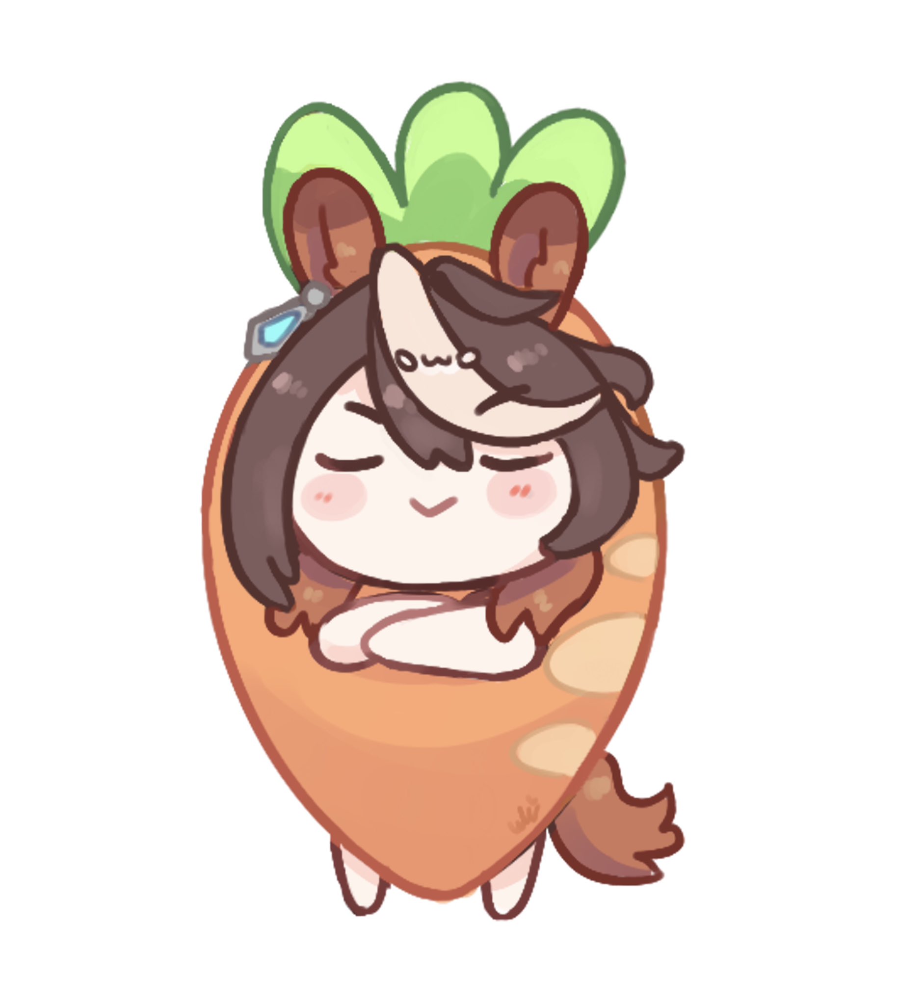 1girl alternate_costume animal_ears blush brown_hair carrot_costume chibi closed_eyes closed_mouth commentary crossed_arms earrings english_commentary food_costume hair_between_eyes highres horse_ears horse_girl horse_tail jewelry long_hair multicolored_hair smile smug streaked_hair symboli_rudolf_(umamusume) tail ukichan22905846 umamusume white_hair