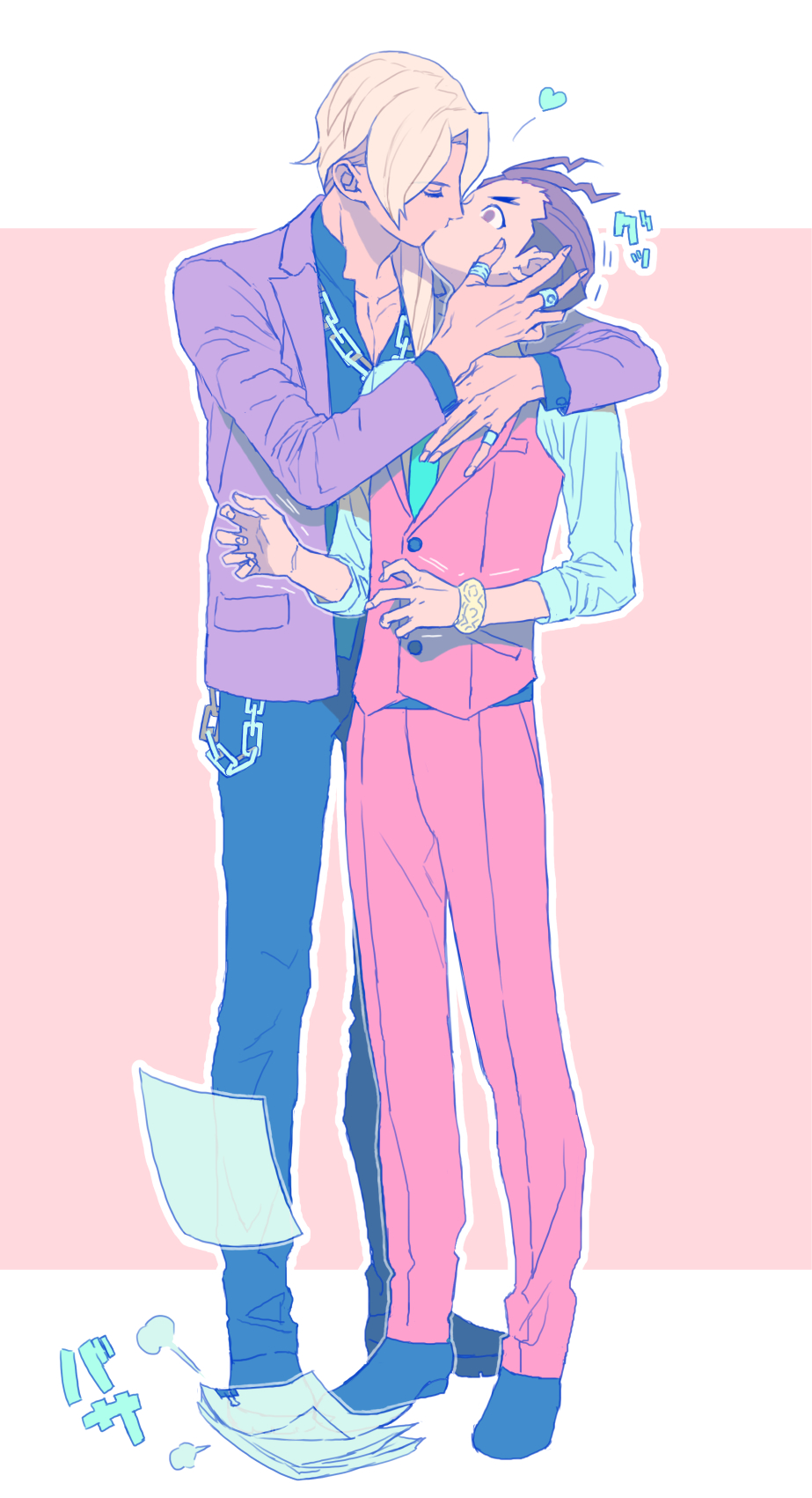 2boys ace_attorney apollo_justice apollo_justice:_ace_attorney arm_around_shoulder black_pants black_shirt black_shoes brown_hair chain closed_mouth collarbone collared_shirt commentary_request full_body hand_on_another's_face heart highres hover_hand jacket kiss klavier_gavin layered_sleeves long_sleeves male_focus multiple_boys open_clothes open_collar open_jacket ouse_(otussger) pants paper parted_bangs purple_jacket red_pants red_vest shirt shoes short_hair standing suit_jacket vest white_shirt wide-eyed yaoi