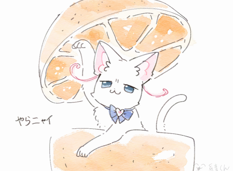 :3 animal animal_ear_fluff animal_focus blue_bow blue_bowtie blue_eyes bow bowtie cat closed_mouth commentary_request food fruit in_food itomugi-kun nekoyashiki_yuki nekoyashiki_yuki_(cat) no_humans orange_(fruit) precure simple_background white_background white_cat wonderful_precure!