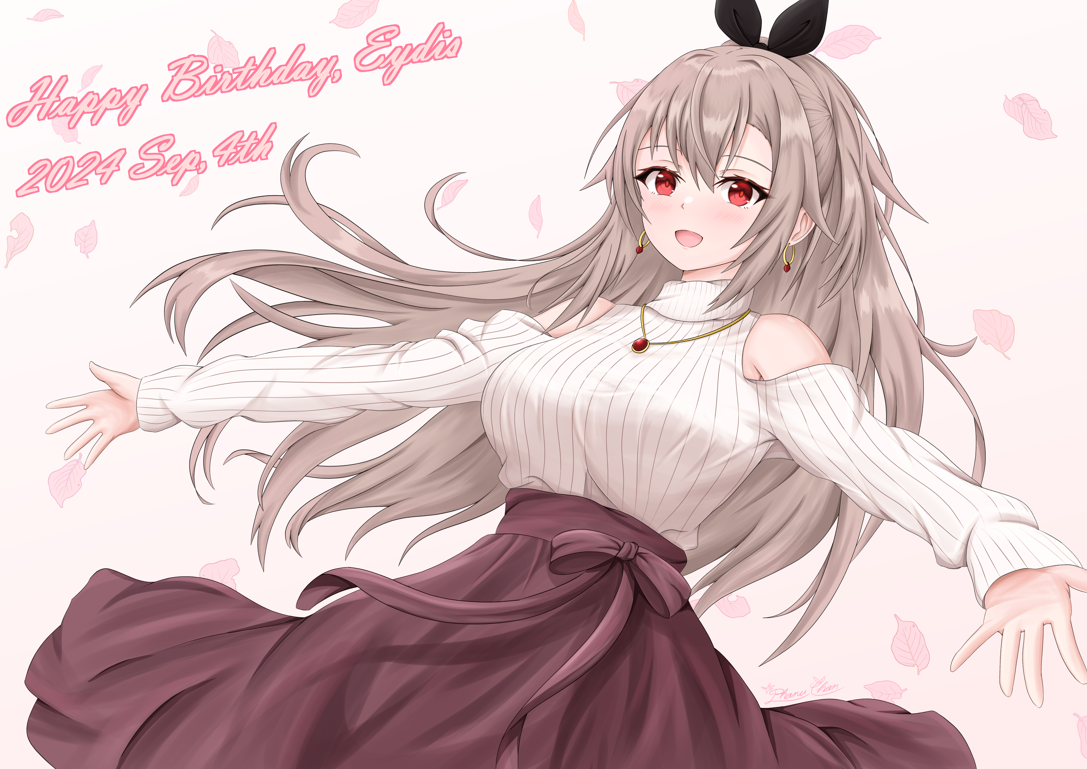 1girl :d absurdres alternate_costume bare_shoulders black_ribbon breasts brown_hair brown_skirt character_name clothing_cutout commentary cowboy_shot earrings english_commentary eydis_(sao) falling_leaves floating gem hair_ribbon happy_birthday high-waist_skirt high_ponytail highres jewelry large_breasts leaf light_blush long_hair long_sleeves looking_at_viewer medium_skirt messy_hair necklace open_mouth outstretched_arms phanuchan pink_leaf ponytail red_eyes red_gem ribbed_sweater ribbon shoulder_cutout simple_background skirt smile solo spread_arms sweater sword_art_online sword_art_online:_alicization sword_art_online:_unleashed_blading turtleneck turtleneck_sweater white_background white_sweater