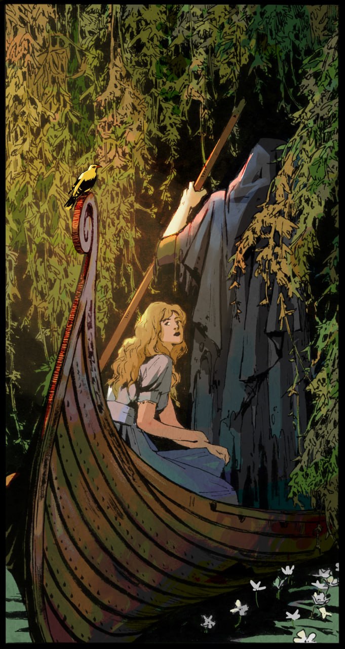 1girl 1other ambiguous_gender animal bird black_border black_cape black_lips blonde_hair blue_skirt boat border cape commentary elena_kononenko flower gondola grey_shirt highres holding holding_oar hood hood_up hooded_cape long_hair looking_back oar on_boat original outdoors plant scenery shirt short_sleeves sitting skirt standing turning_head untranslatable_commentary vines watercraft wavy_hair white_flower yellow_bird
