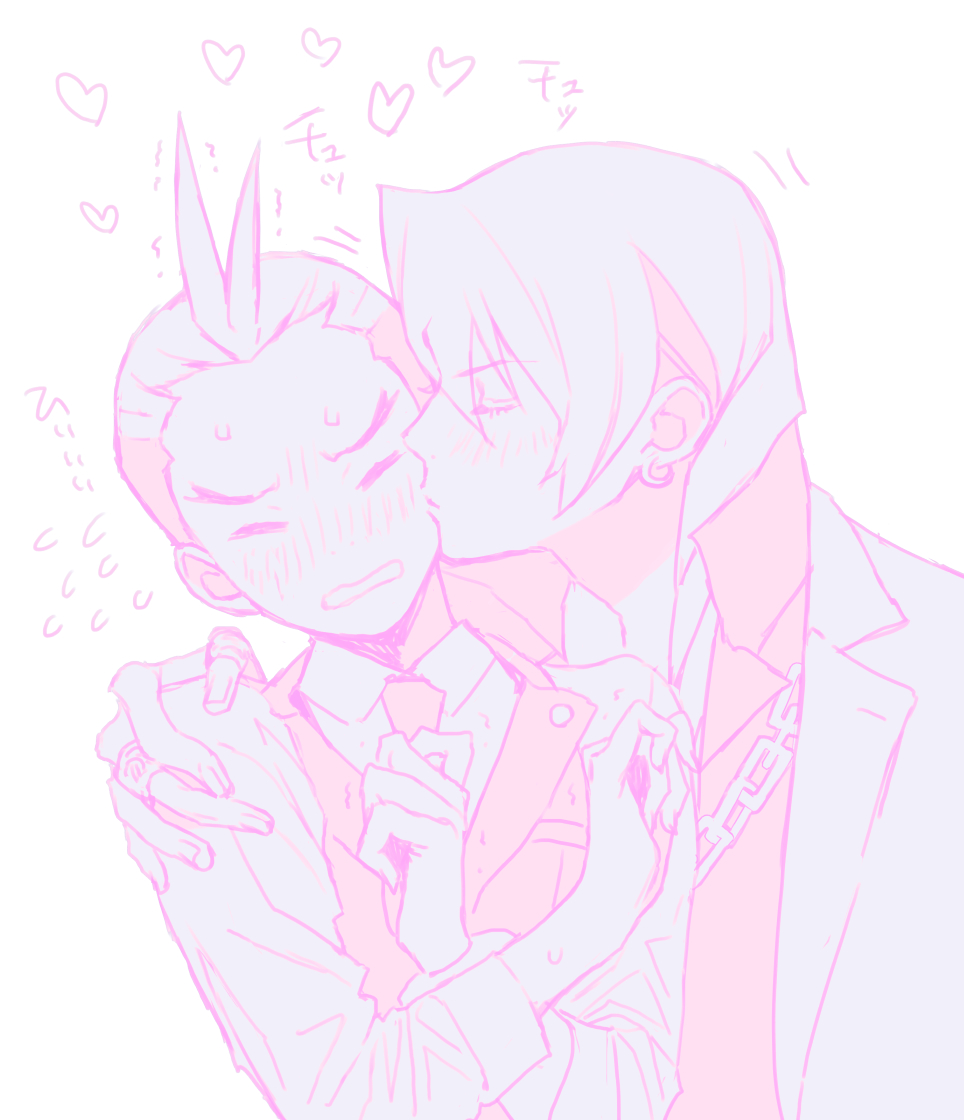 2boys ace_attorney antenna_hair apollo_justice apollo_justice:_ace_attorney blush chain chain_necklace clenched_teeth closed_eyes collarbone collared_shirt commentary_request earrings forked_eyebrows hair_behind_ear hand_on_another's_shoulder heart jewelry kiss kissing_cheek klavier_gavin lapels long_sleeves male_focus monochrome multiple_boys necklace notched_lapels open_collar ouse_(otussger) piercing shirt simple_background teeth vest white_background wing_collar yaoi