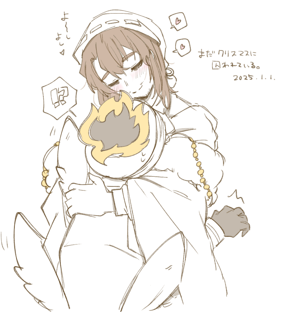 !? 1boy 1other absurdres alternate_costume arthropod_limbs bags_under_eyes beads beard_stubble black_fire blanket blush bow bowtie brown_hair chain christmas_nightmare_(e.g.o) clock closed_eyes closed_mouth coat collared_dress dante_(limbus_company) dress e.g.o_(project_moon) extra_arms facial_hair fire fur-trimmed_shawl fur_collar fur_trim gloves gregor_(project_moon) hair_between_eyes happy hat head_tilt heart highres hug lily26983455 limbus_company limited_palette long_hair long_sleeves male_focus monochrome monster monster_boy neck_ribbon nightcap object_head official_alternate_costume pajamas photoshop_(medium) project_moon ribbon ribbon-trimmed_hat shawl simple_background sketch smile speech_bubble spoken_heart spoken_interrobang spot_color stubble sweat sweatdrop upper_body white_background yaoi yellow_fire
