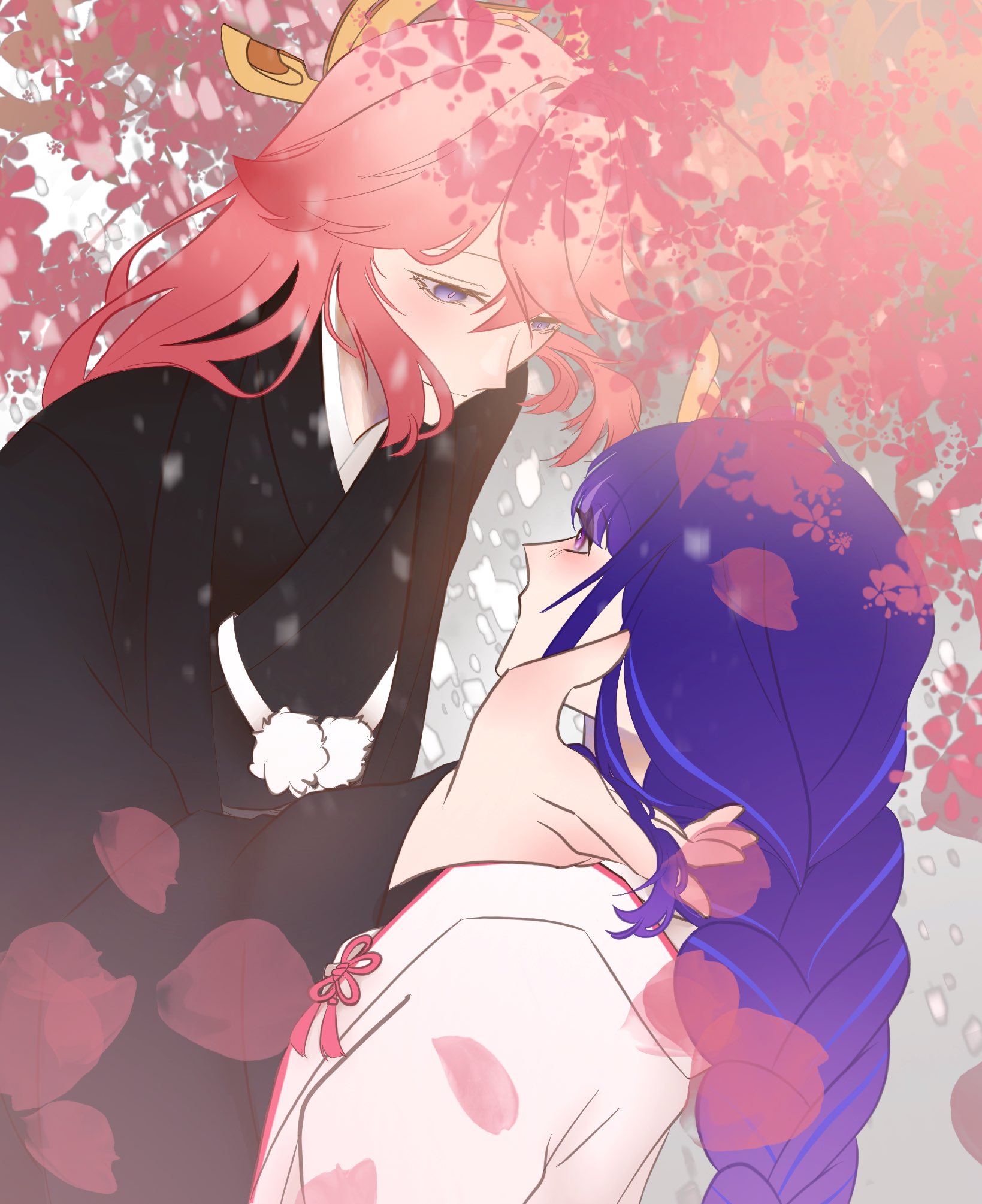 2girls alternate_costume animal_ears black_robe blurry blush braid cherry_blossoms close-up closed_mouth commentary couple depth_of_field english_commentary fox_ears fox_girl from_above from_side genshin_impact hair_between_eyes hair_ornament headpiece highres japanese_clothes kimono long_braid long_sleeves multicolored_hair multiple_girls pink_hair purple_eyes purple_hair raiden_shogun robe shade single_braid streaked_hair tree tree_shade uchikake upper_body wedding white_robe wide_sleeves yae_miko yaeei_madtad yuri