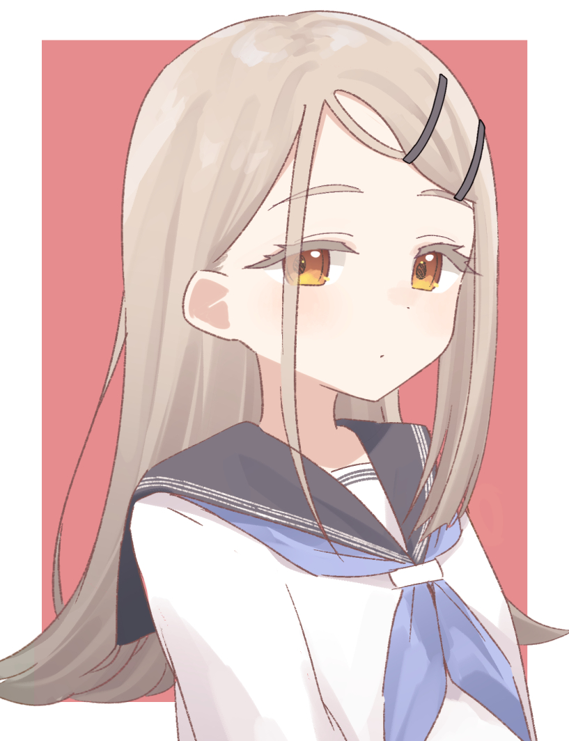 1girl black_sailor_collar blonde_hair blue_neckerchief border closed_mouth colored_eyelashes commentary enji-kun flipped_hair gakuen_idolmaster hair_ornament hairclip idolmaster long_hair looking_at_viewer neckerchief orange_eyes outside_border parallel_hairclips red_background sailor_collar sailor_shirt shinosawa_hiro shirt solo swept_bangs upper_body white_border white_shirt