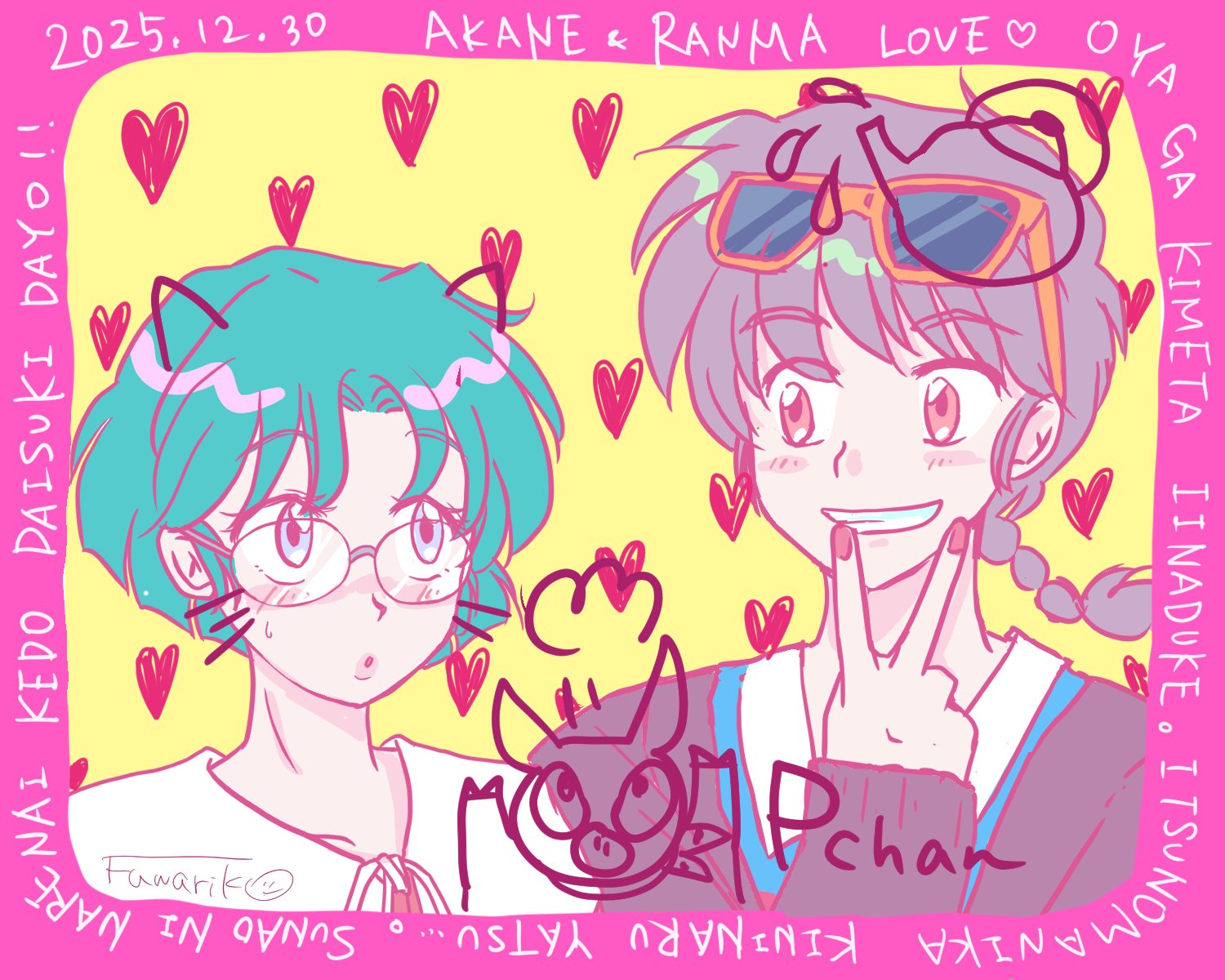 1boy 1girl blue_eyes braid brown_eyes brown_nails commentary_request eyewear_on_head fuwariko green_hair grey_hair grin heart heart_background highres p-chan_(ranma_1/2) pink_lips ranma_1/2 romaji_text round_eyewear saotome_ranma short_hair single_braid smile tendou_akane v