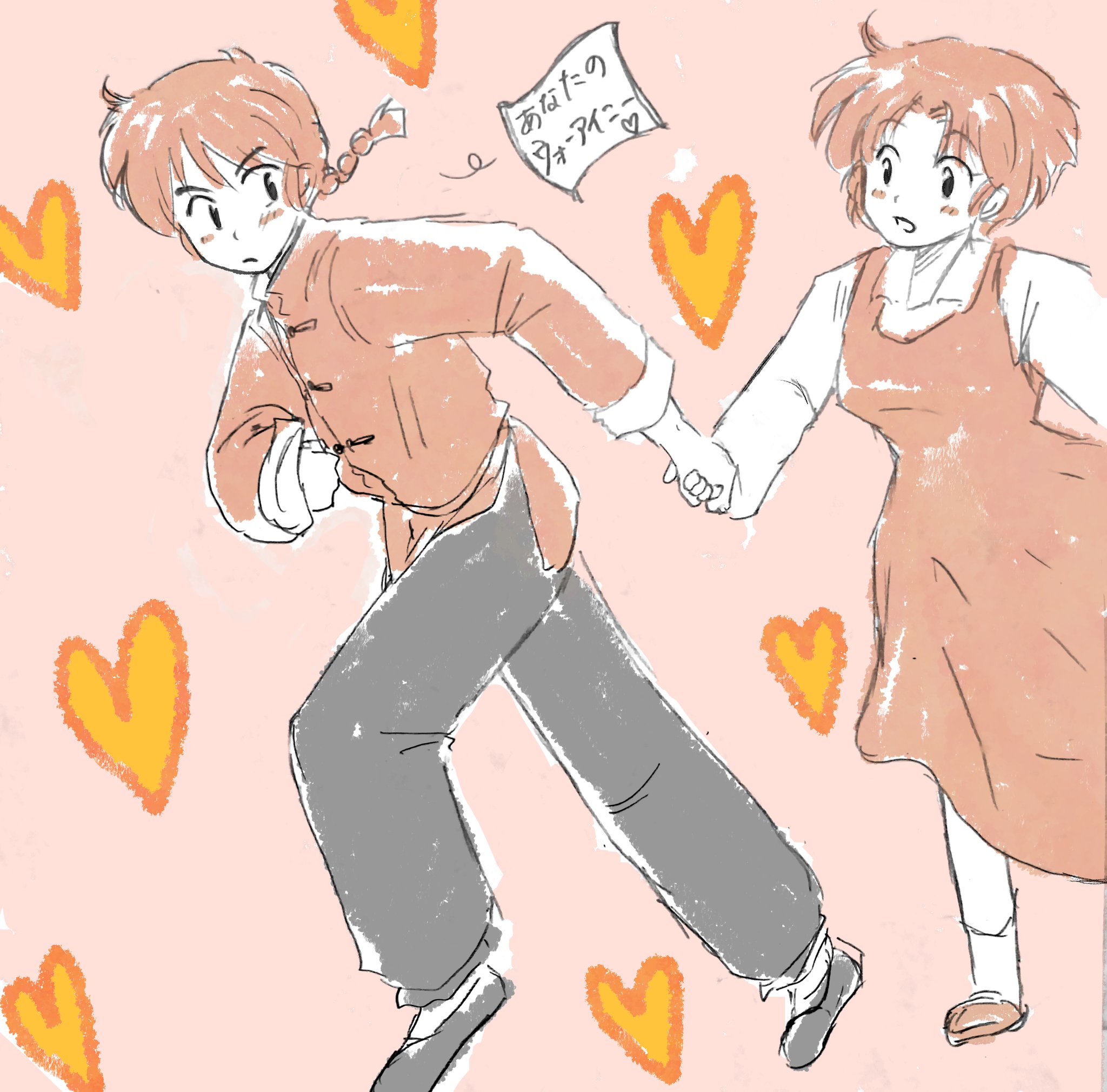 1boy 1girl blush_stickers braid brown_dress brown_hair brown_shoes chinese_clothes commentary_request dress fuwariko grey_pants grey_shoes heart heart_background highres holding_hands open_mouth pants pink_background ranma_1/2 saotome_ranma shoes short_hair single_braid tendou_akane