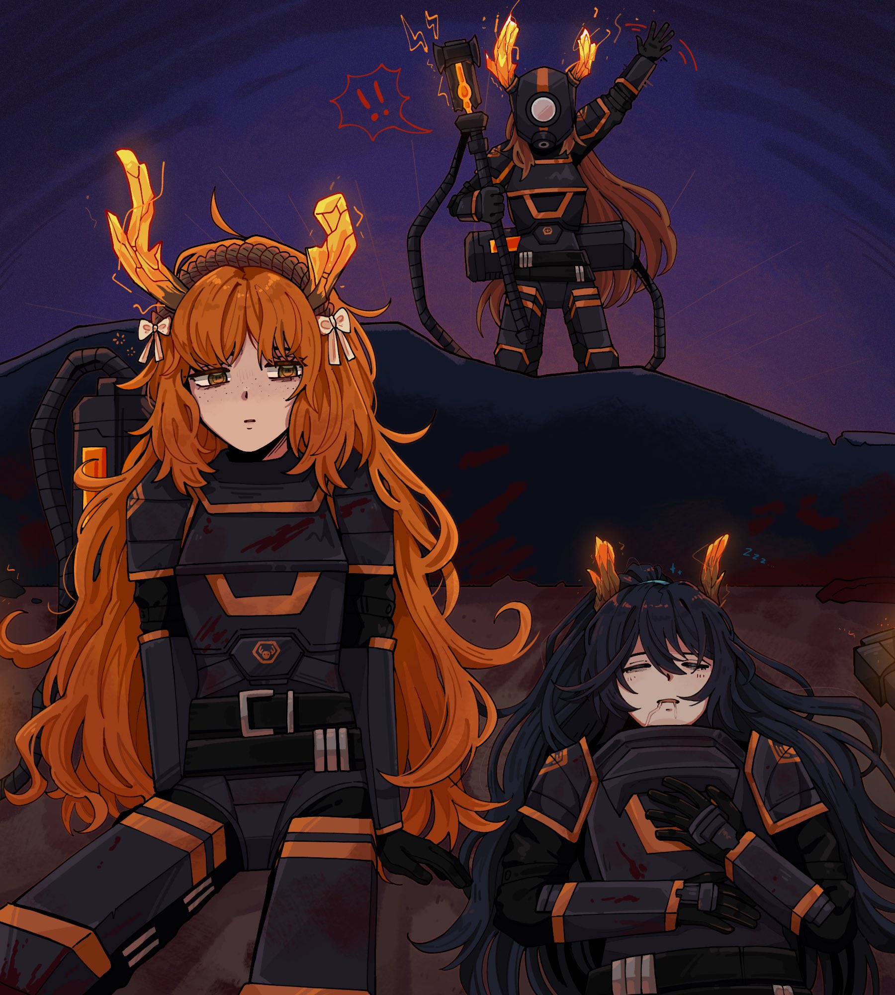 ! !! 1girl 2girls antlers armor black_armor black_bodysuit black_gloves black_hair bodysuit bow brown_hair gloves green_eyes hair_bow highres holding holding_staff hong_lu_(project_moon) horns impulserain12 ishmael_(project_moon) limbus_company long_hair multiple_girls open_mouth orange_hair project_moon r_corp._(identity)_(project_moon) reindeer_antlers rodion_(project_moon) sidelocks speech_bubble staff very_long_hair waving white_bow