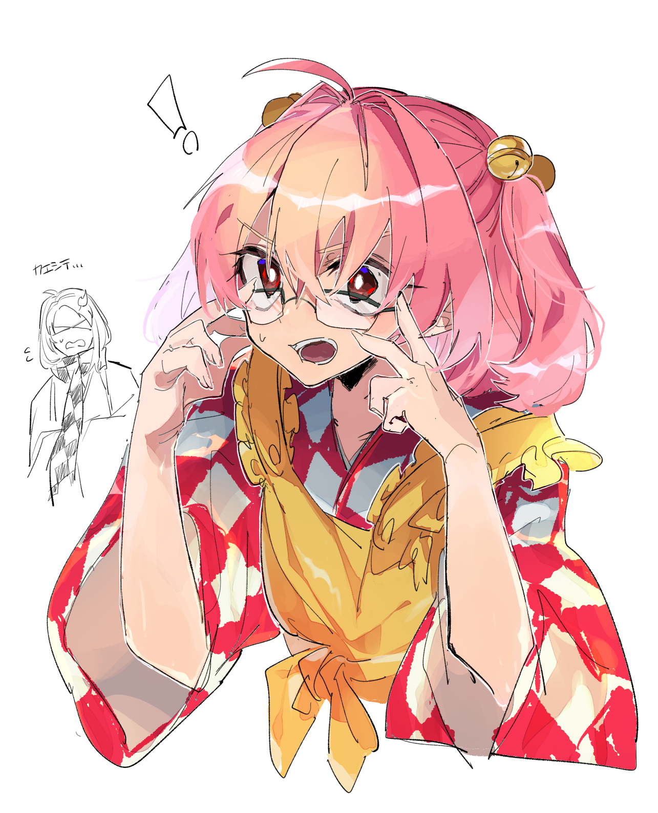 ! 2girls apron bell checkered_clothes checkered_kimono commentary_request futatsuiwa_mamizou futatsuiwa_mamizou_(human) fuuga_(perv_rsity) glasses hair_bell hair_ornament highres japanese_clothes jingle_bell kimono long_sleeves medium_hair motoori_kosuzu multiple_girls open_mouth pink_hair red_eyes simple_background solo_focus speech_bubble sweatdrop touhou translated two_side_up upper_body white_background wide_sleeves yellow_apron