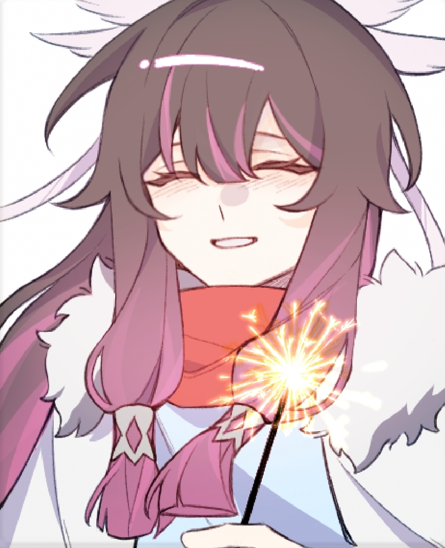 alternate_costume blush brown_hair chinese_commentary closed_eyes coat columbina_(genshin_impact) commentary_request fireworks fur-trimmed_coat fur_trim genshin_impact gradient_hair head_wings holding holding_fireworks jixushendushuimian long_hair multicolored_hair open_mouth pink_hair red_scarf scarf simple_background smile solo sparkler streaked_hair upper_body white_background white_coat white_wings wings