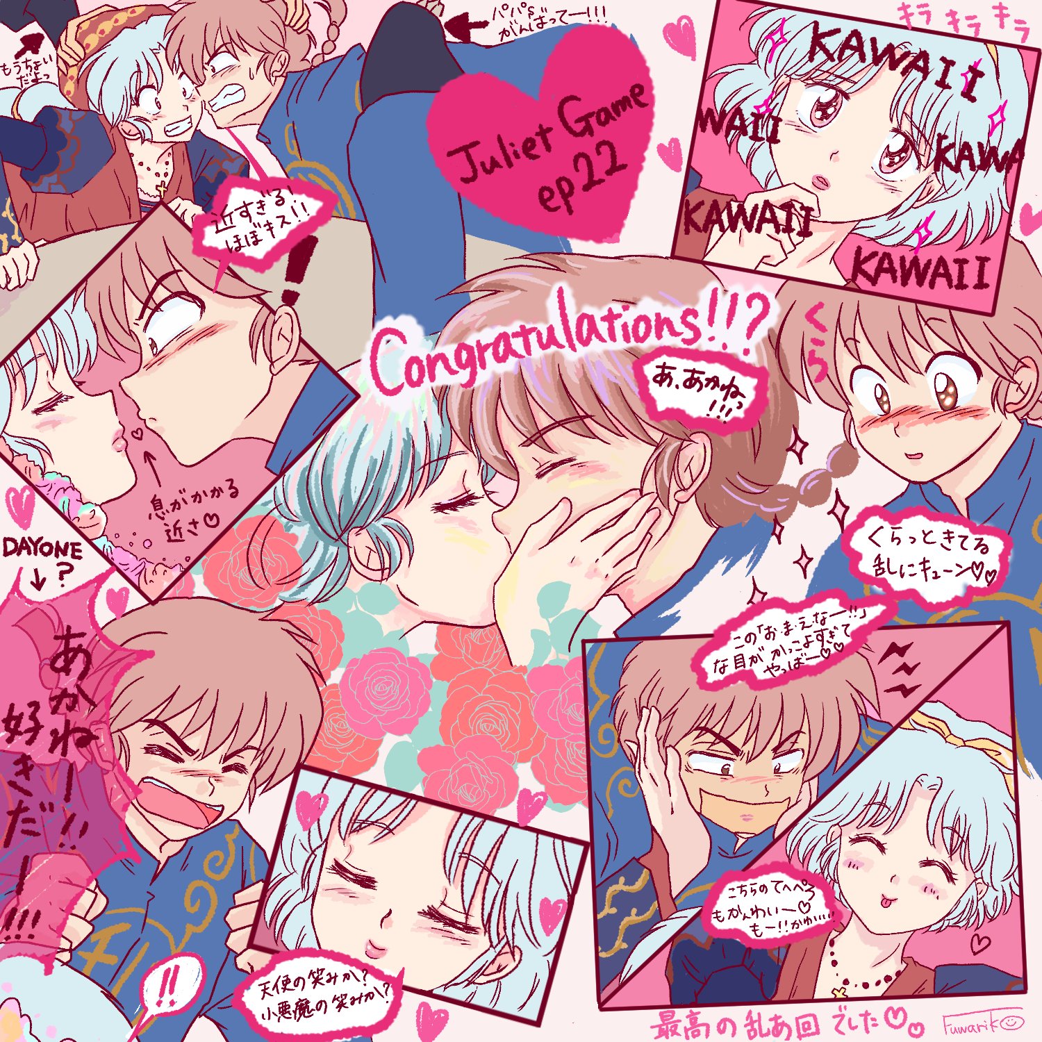 1boy 1girl ^_^ blue_hair blush braid brown_eyes brown_hair clenched_teeth closed_eyes closed_mouth commentary_request cosplay flower fuwariko gag hand_on_another's_cheek hand_on_another's_face hetero highres improvised_gag juliet_capulet juliet_capulet_(cosplay) juliet_sleeves kiss long_sleeves mixed-language_text open_mouth pink_eyes pink_flower pink_lips puffy_sleeves ranma_1/2 red_flower romaji_text saotome_ranma short_hair single_braid tape tape_gag teeth tendou_akane tongue tongue_out translation_request v-shaped_eyebrows wide-eyed