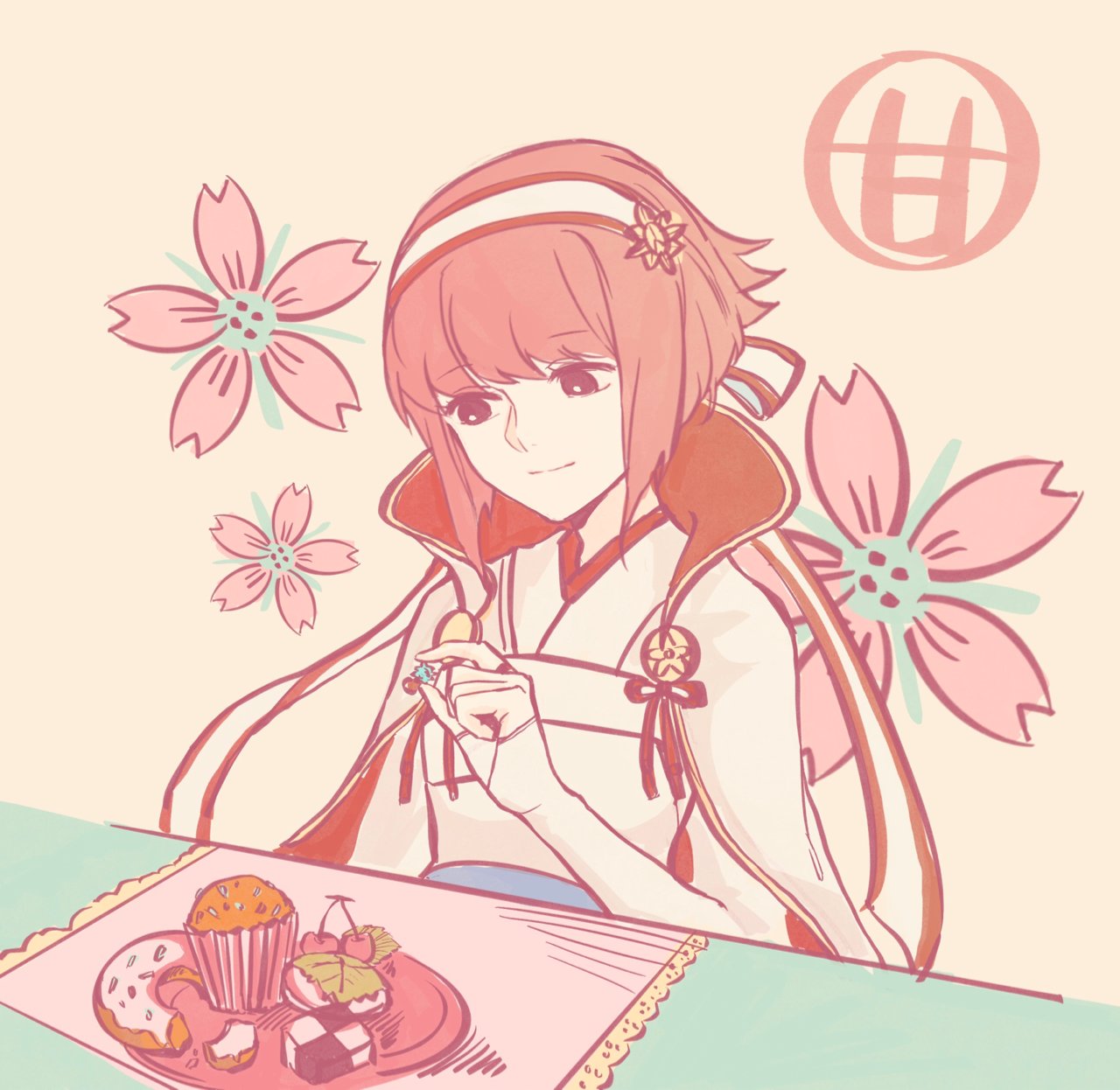 1girl artist_collaboration brown_background commentary_request cookie cupcake fire_emblem fire_emblem_fates food fuckingthisworl hairband highres japanese_clothes mitsuhone nintendo one-hour_drawing_challenge pink_eyes pink_hair sakura_(fire_emblem) smile solo