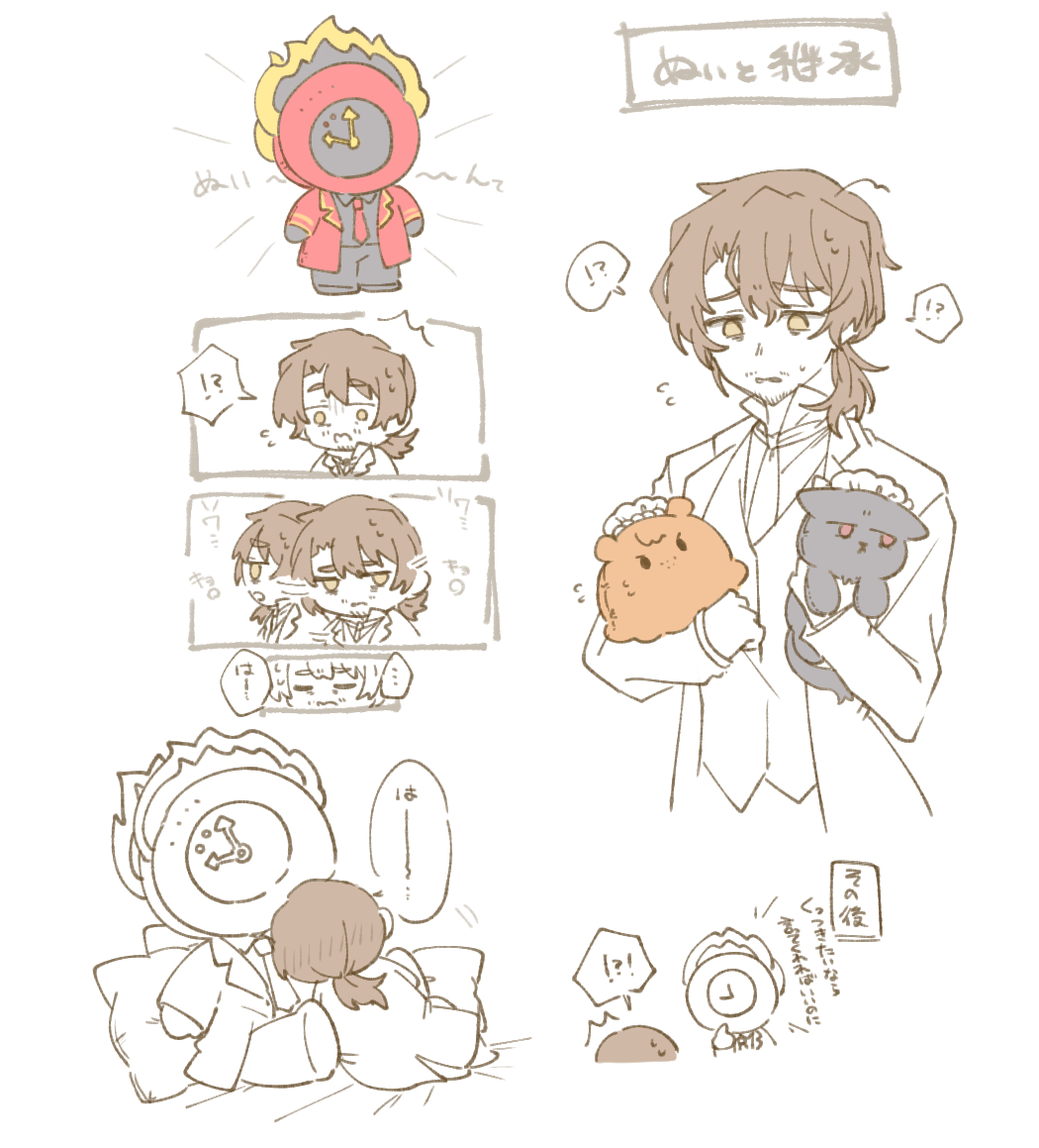 !? ... 1boy 1other 5koma 6+koma :3 ^^^ absurdres afterimage alternate_costume bags_under_eyes beard_stubble bed brown_eyes brown_hair character_doll chibi clock closed_eyes closed_mouth coat collared_shirt comic dante_(limbus_company) doll dress_shirt emphasis_lines expressionless facial_hair finger_to_own_chin fire flying_sweatdrops formal_clothes gloves gregor_(project_moon) hair_between_eyes hair_intakes head_blush high_collar highres holding holding_doll holding_stuffed_toy hug ishmael_(project_moon) jitome lily26983455 limbus_company long_coat long_hair long_sleeves looking_at_another looking_at_object low_ponytail lying male_focus motion_lines multiple_views necktie object_head on_bed open_mouth pants parted_bangs parted_lips partially_colored pillow ponytail project_moon ryoshu_(project_moon) sanpaku shirt simple_background solo_focus speech_bubble spoken_interrobang spot_color stubble stuffed_animal stuffed_cat stuffed_octopus stuffed_toy suit surprised sweat sweatdrop tuxedo vest white_background wuthering_heights_(identity)_(project_moon)