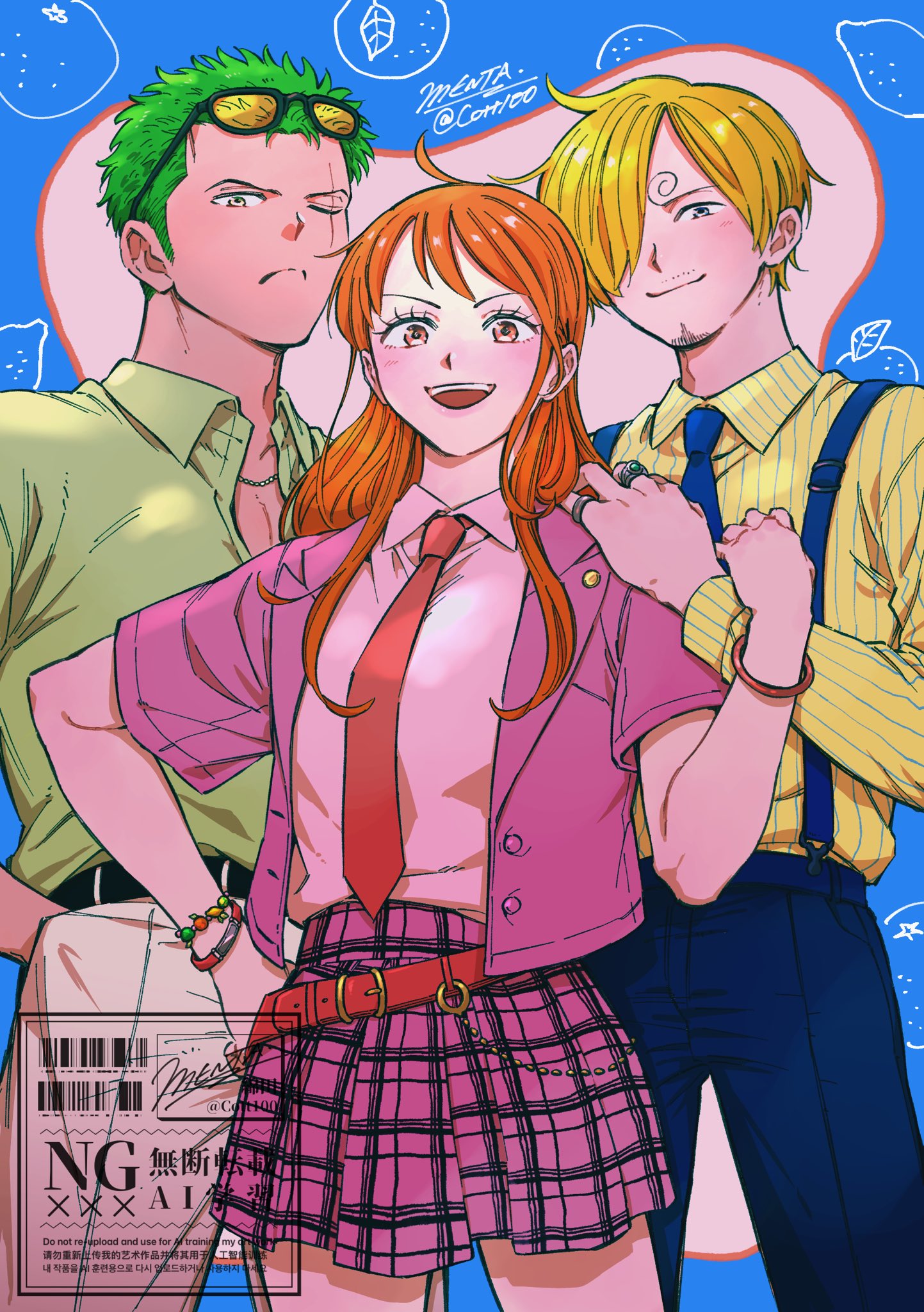 &{ID:13732932 CreatedAt:Thu Mar 26 15:30:08 -0500 2026 Score:0 Width:1443 Height:2048 MD5:906c217fbbdc5a2c842e2788a9b3c427 Directory:90/6c Image:906c217fbbdc5a2c842e2788a9b3c427.jpg Rating:general Source:https://x.com/Cott100/status/2037102781623140363 Change:1774557008 Owner:danbooru CreatorID:6498 ParentID:0 Sample:1 PreviewHeight:350 PreviewWidth:246 Tags:1girl 2boys alternate_costume bangle belt belt_buckle blonde_hair bracelet buckle checkered_clothes checkered_skirt closed_mouth commentary cott100 cowboy_shot eyewear_on_head facial_hair food fruit green_hair green_shirt hair_over_one_eye hand_on_another's_shoulder hand_on_own_hip highres jacket jewelry long_hair looking_at_viewer mandarin_orange multiple_boys multiple_rings nami_(one_piece) necktie one_eye_closed one_piece open_clothes open_jacket open_mouth orange_hair pants pink_jacket pink_shirt pink_skirt pleated_skirt red_belt red_necktie ribbed_shirt ring roronoa_zoro sanji_(one_piece) scar scar_across_eye scar_on_face shirt short_hair skirt smile stubble sunglasses suspenders twitter_username untranslatable_commentary wing_collar yellow_shirt Title: HasNotes:false HasComments:false FileURL:https://img2.gelbooru.com/images/90/6c/906c217fbbdc5a2c842e2788a9b3c427.jpg PreviewURL:https://gelbooru.com/thumbnails/90/6c/thumbnail_906c217fbbdc5a2c842e2788a9b3c427.jpg SampleURL:https://img2.gelbooru.com/samples/90/6c/sample_906c217fbbdc5a2c842e2788a9b3c427.jpg SampleHeight:1206 SampleWidth:850 Status:active PostLocked:0 HasChildren:false IsVideo:false DisplayDate:26.03.2026 15:30}