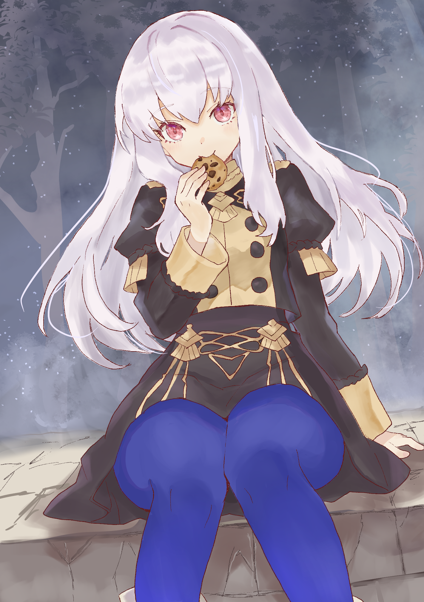 1girl blue_pantyhose breasts commentary_request cookie eating fire_emblem fire_emblem:_three_houses food food_in_mouth garreg_mach_monastery_uniform highres hiiragi_yoko juliet_sleeves long_hair long_sleeves looking_at_viewer lysithea_von_ordelia nintendo pantyhose pink_eyes puffy_sleeves sitting small_breasts smile solo thighs white_hair