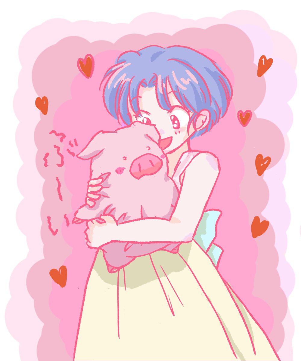 1girl :d commentary_request dress fuwariko heart heart_background highres holding holding_stuffed_toy open_mouth pink_background pink_eyes ranma_1/2 short_hair single_bare_shoulder smile solo stuffed_animal stuffed_toy tendou_akane yellow_dress