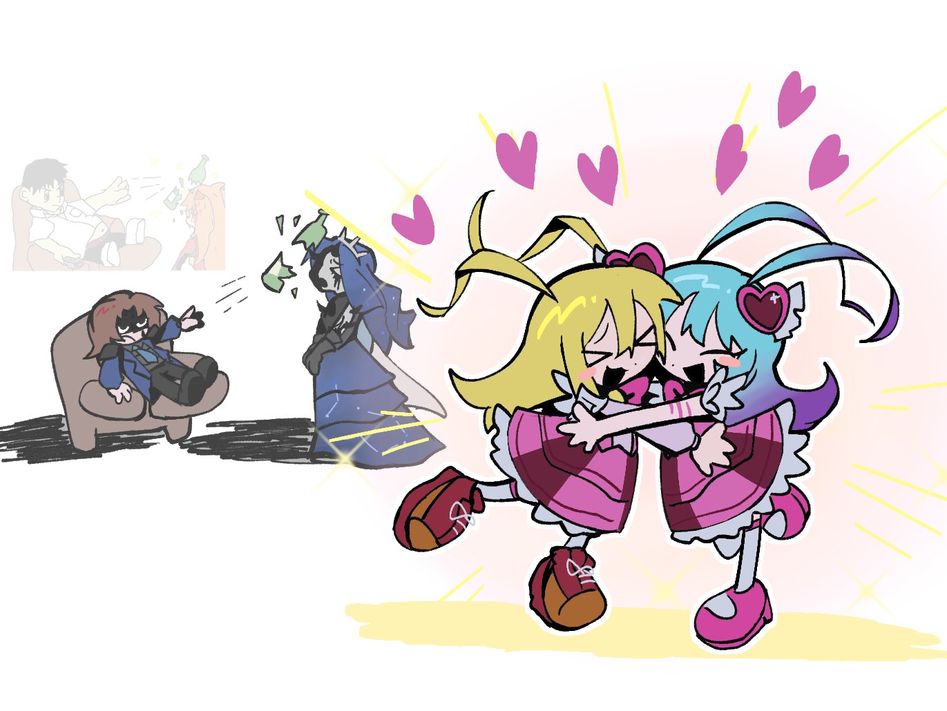 1girl armband black_shirt blonde_hair blue_dress blue_eyes blue_hair blue_necktie bow bowtie brown_hair brown_shoes closed_eyes coat collared_shirt don_quixote_(project_moon) dress e.g.o_(project_moon) facial_mark garter_straps gloves hair_ornament heart heart_hair_ornament in_the_name_of_love_and_hate_(e.g.o) knight_of_despair limbus_company lobotomy_corporation lobotomy_corporation_(identity)_(project_moon) long_hair long_sleeves magical_girl meme multiple_girls necktie open_mouth orange_armband pants pink_bow pink_bowtie pink_garter_straps pink_shoes pink_skirt project_moon queen_of_hatred rodion_(project_moon) shirt shoes skirt smile the_sword_sharpened_with_tears_(e.g.o) thighhighs two_side_up v0ge11 weapon yellow_eyes yuri