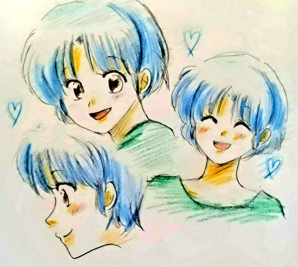 1girl ^_^ black_eyes blue_hair closed_eyes closed_mouth colored_pencil_(medium) commentary_request fuwariko heart open_mouth photo_(medium) ranma_1/2 short_hair smile tendou_akane traditional_media