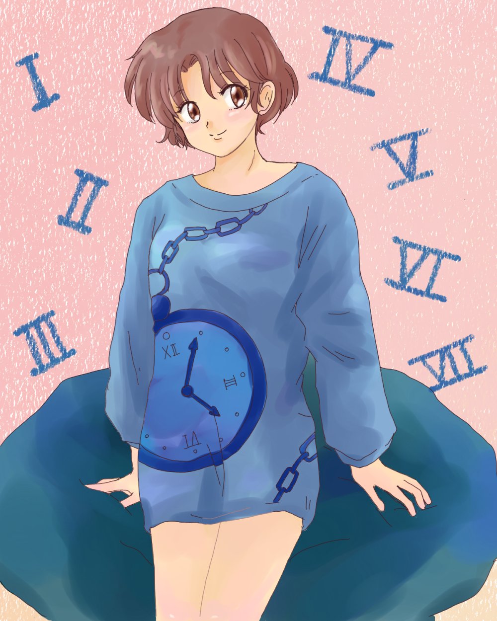 1girl blue_sweater brown_eyes brown_hair closed_mouth commentary_request cowboy_shot fuwariko highres lips pink_background ranma_1/2 roman_numeral short_hair smile solo split_mouth sweater tendou_akane