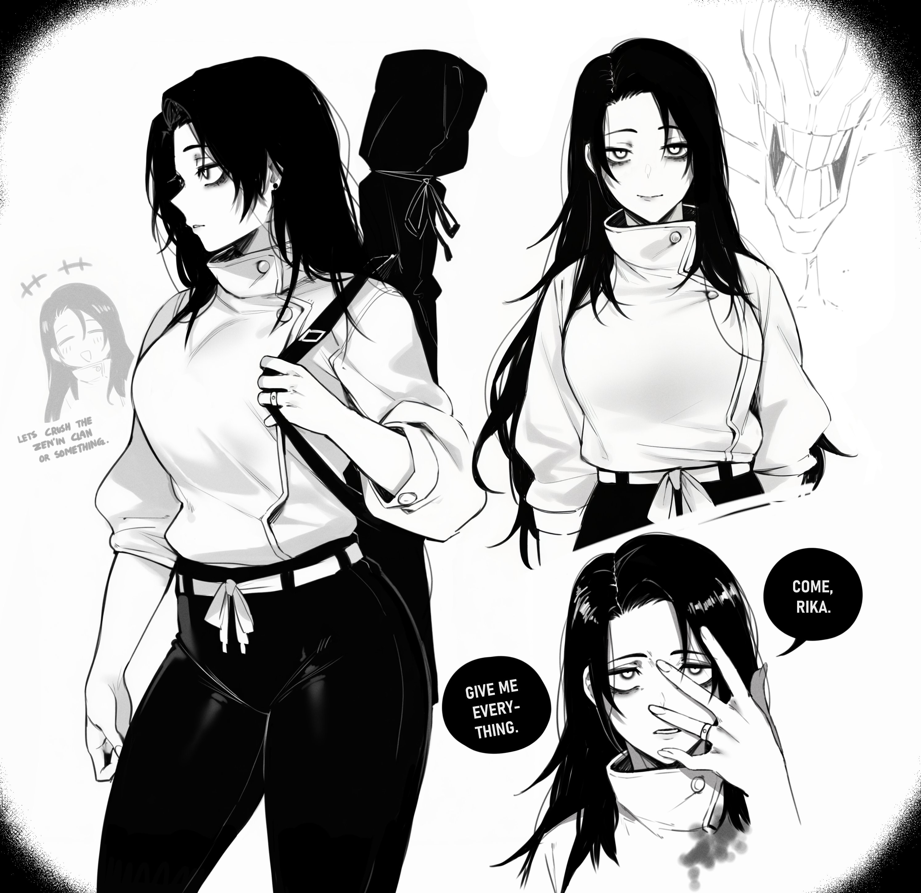 2girls absurdres black_hair breasts english_text facing_to_the_side facing_viewer genderswap genderswap_(mtf) highres jewelry jujutsu_kaisen katana long_hair looking_at_viewer masoq monochrome multiple_girls multiple_views okkotsu_yuta orimoto_rika ring speech_bubble sword tagme weapon